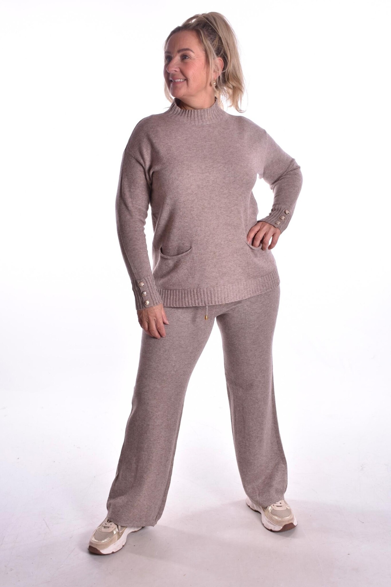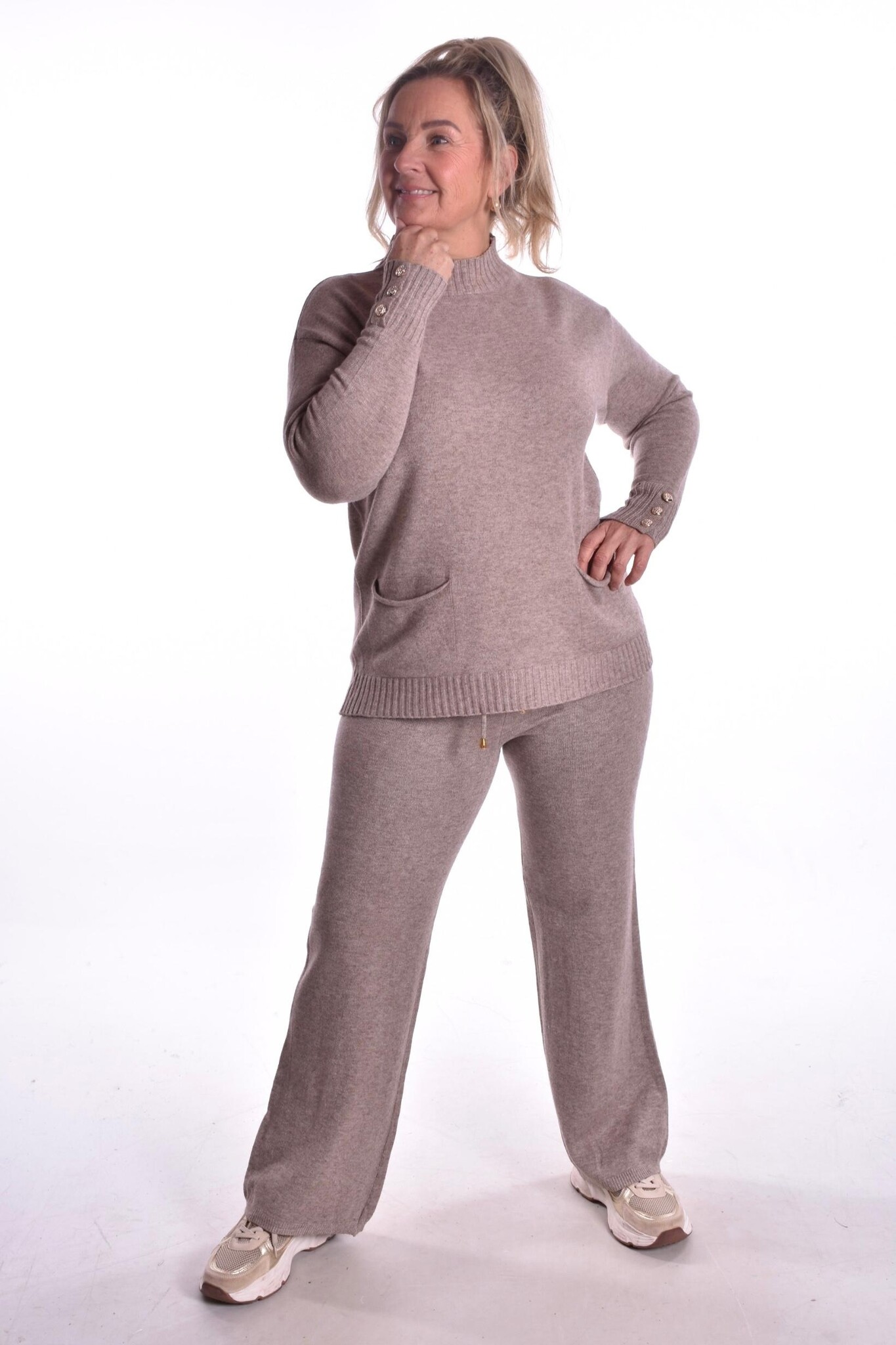 Set Marie is een complete set van zacht fijn breisel, van een mooie kwaliteit met 2 zakjes op de trui en een aanrijgkoordje in de broek. Op de manchetten zitten 3 gouden knoopjes.