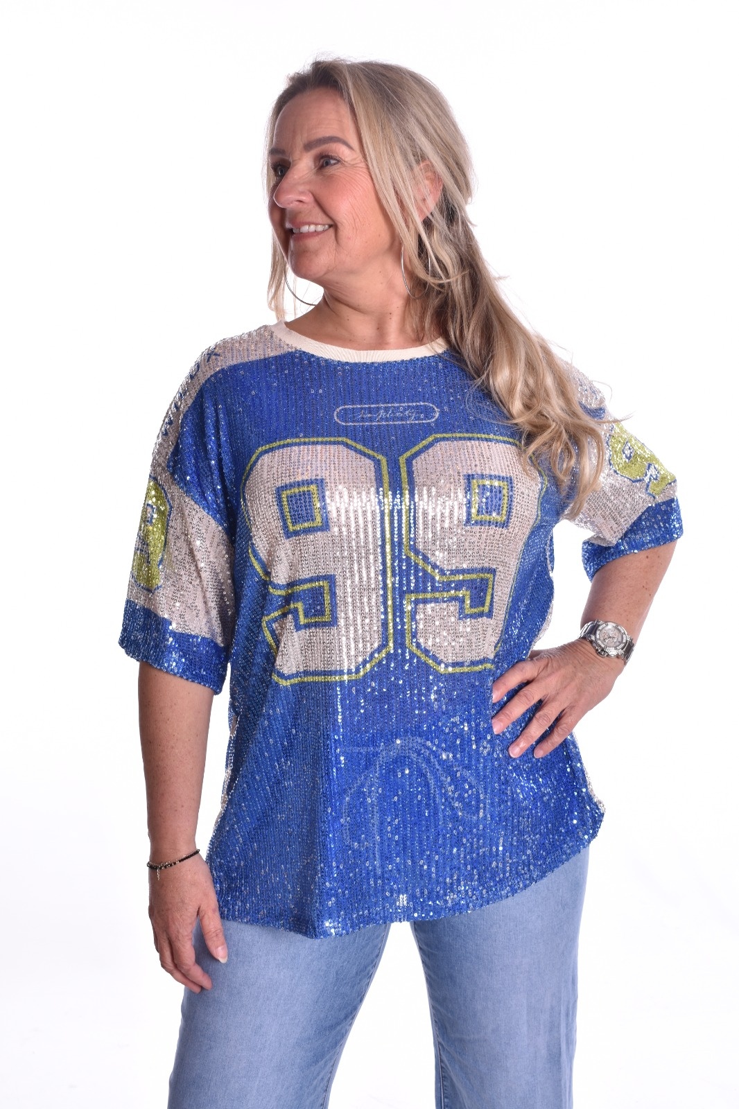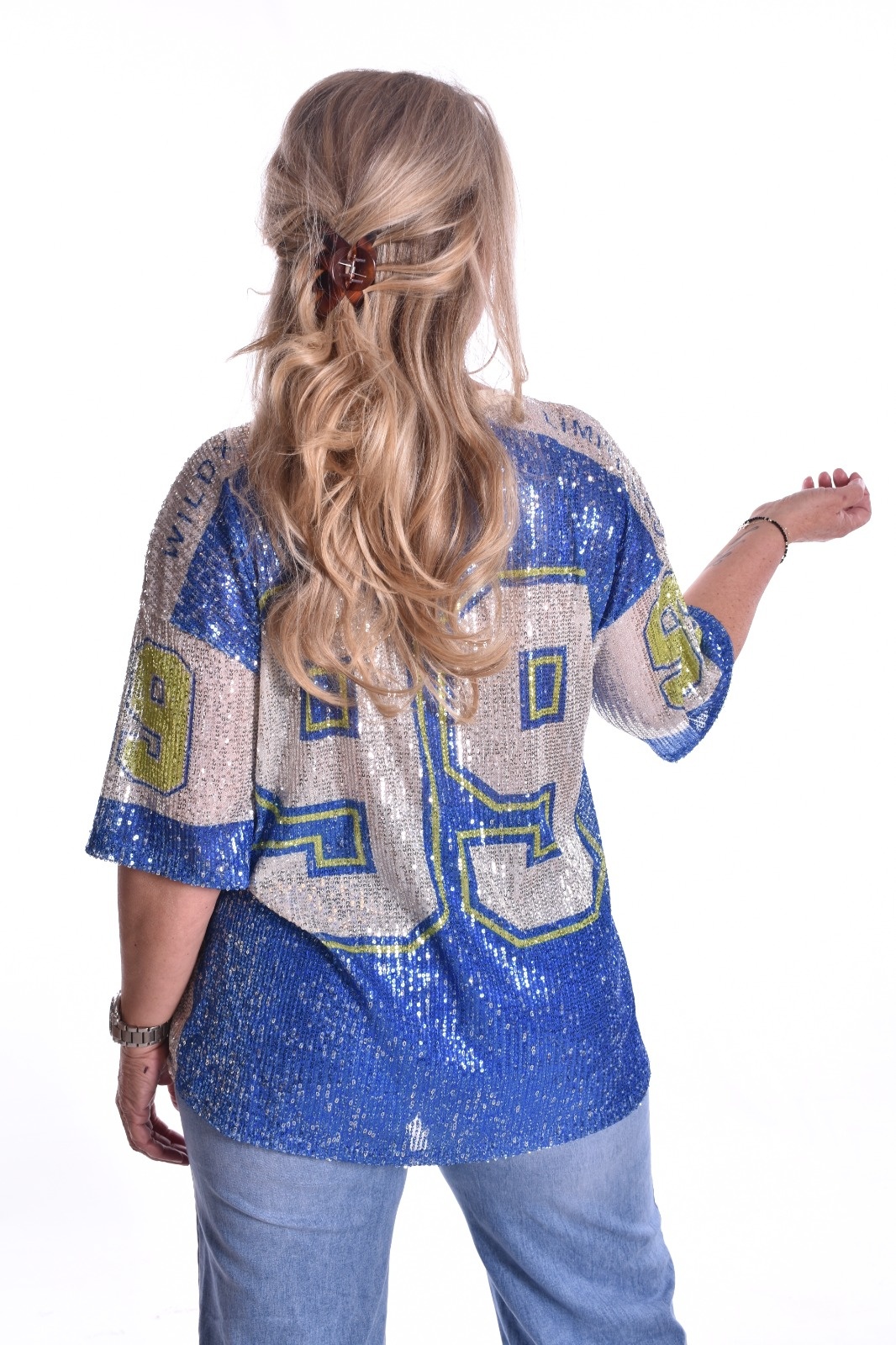 Top met kleine pailletjes. De cijfers zitten ook op de achterkant.