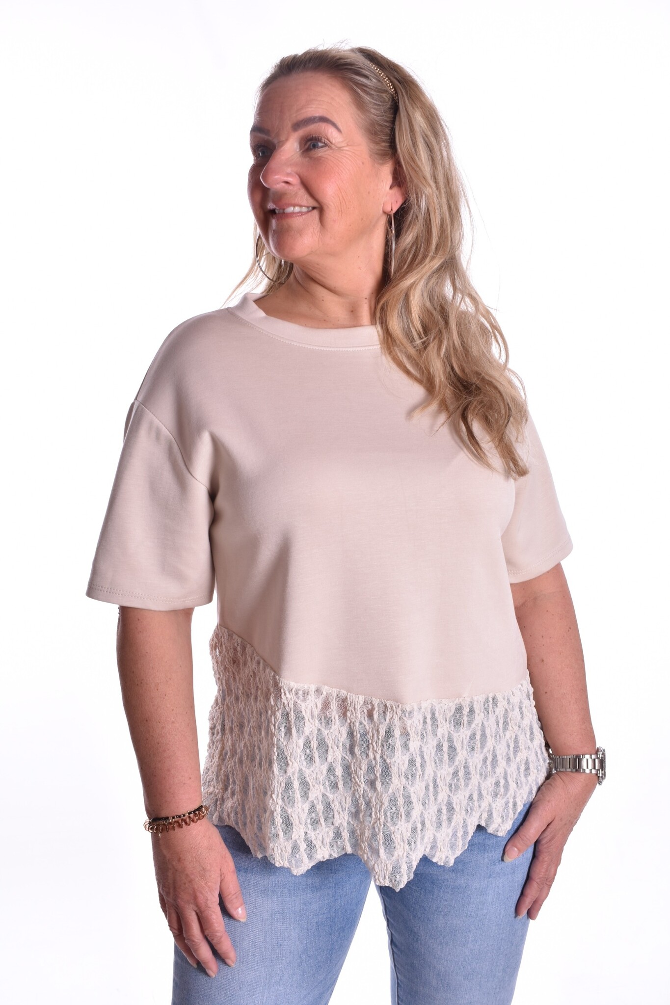 Een top van zachte stof met kant in een schuine lijn aan de onderkant.