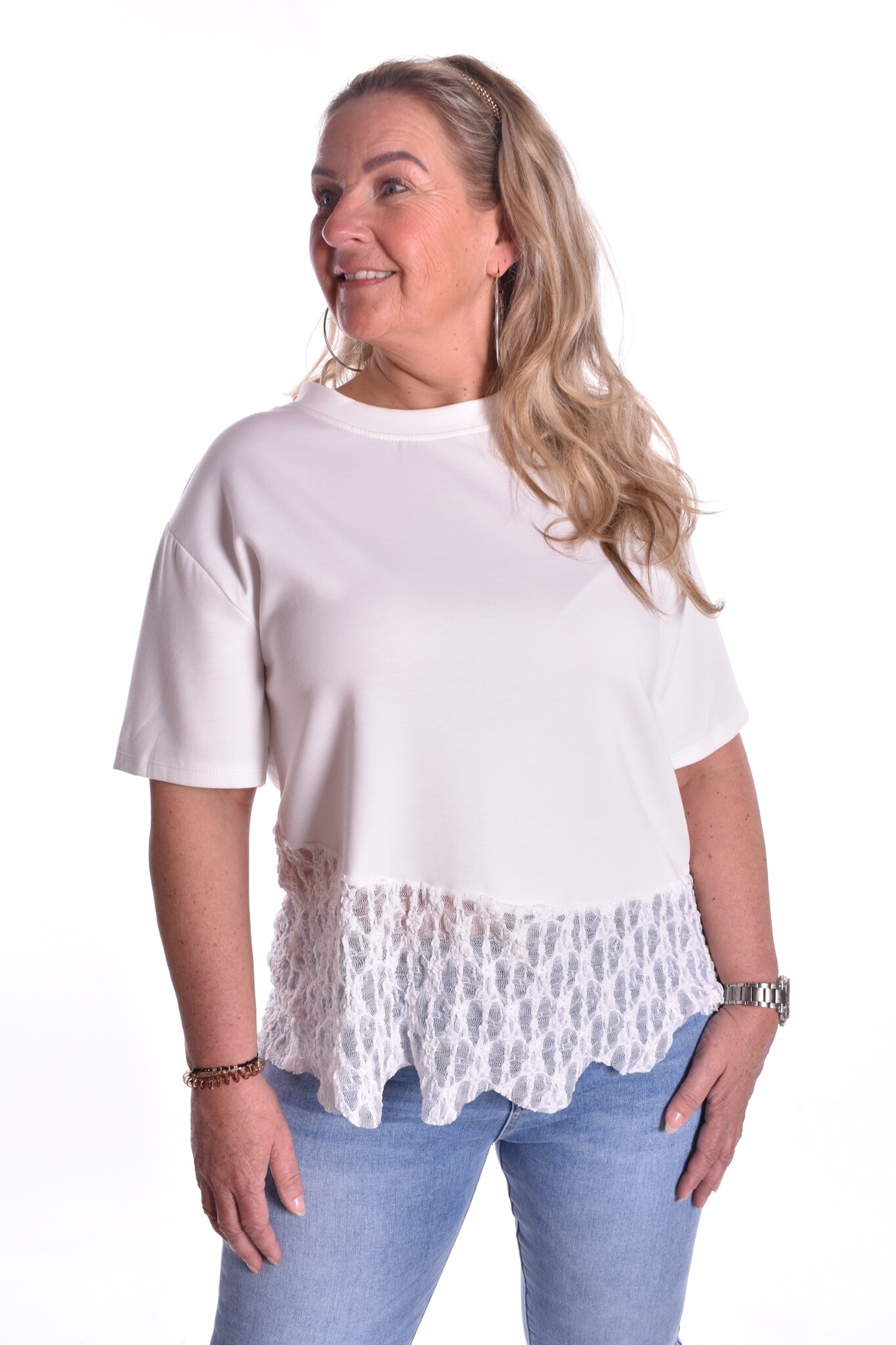 Een top van zachte stof met kant in een schuine lijn aan de onderkant.