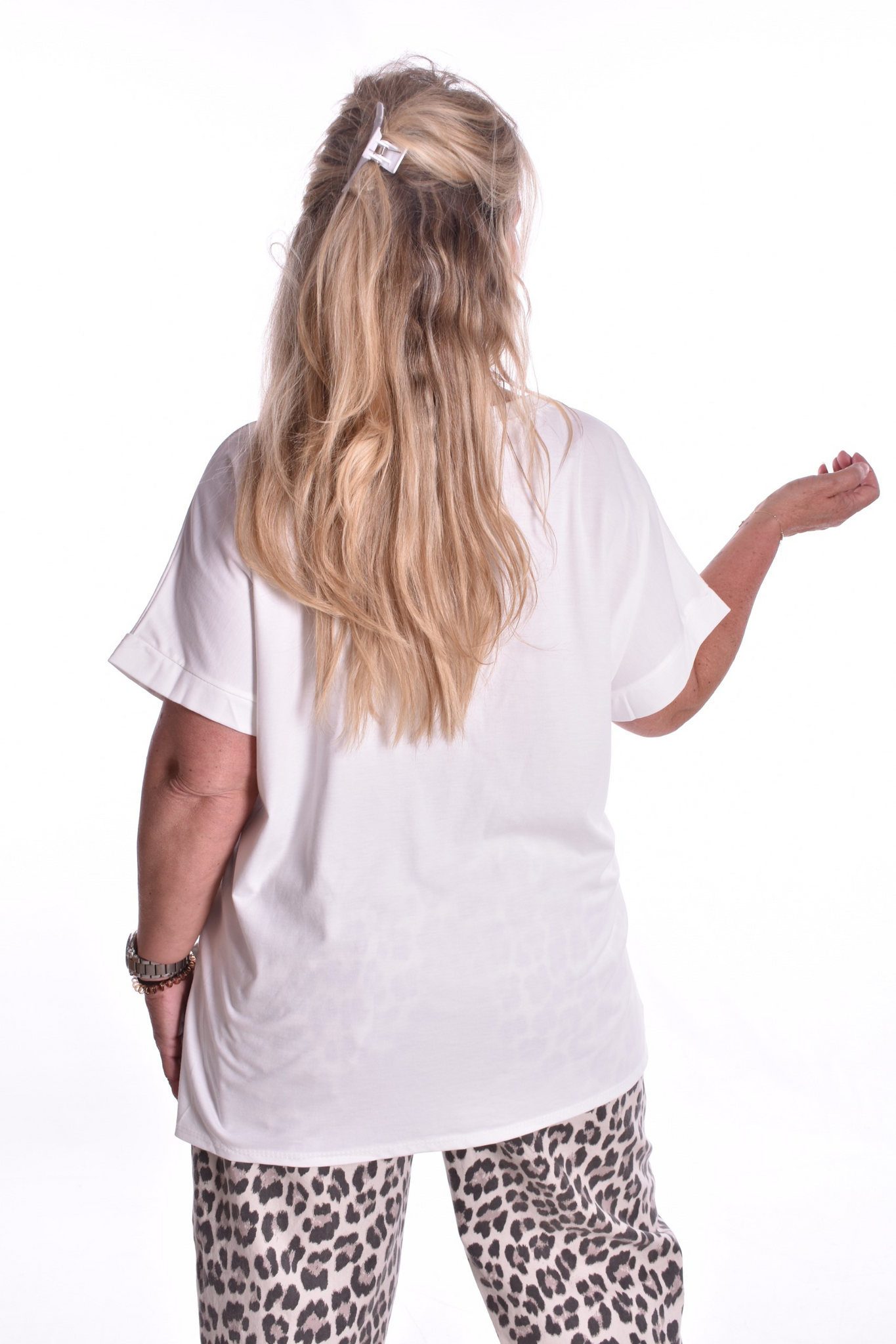 Ons model heeft van boven maat 40 en is 165 cm lang.