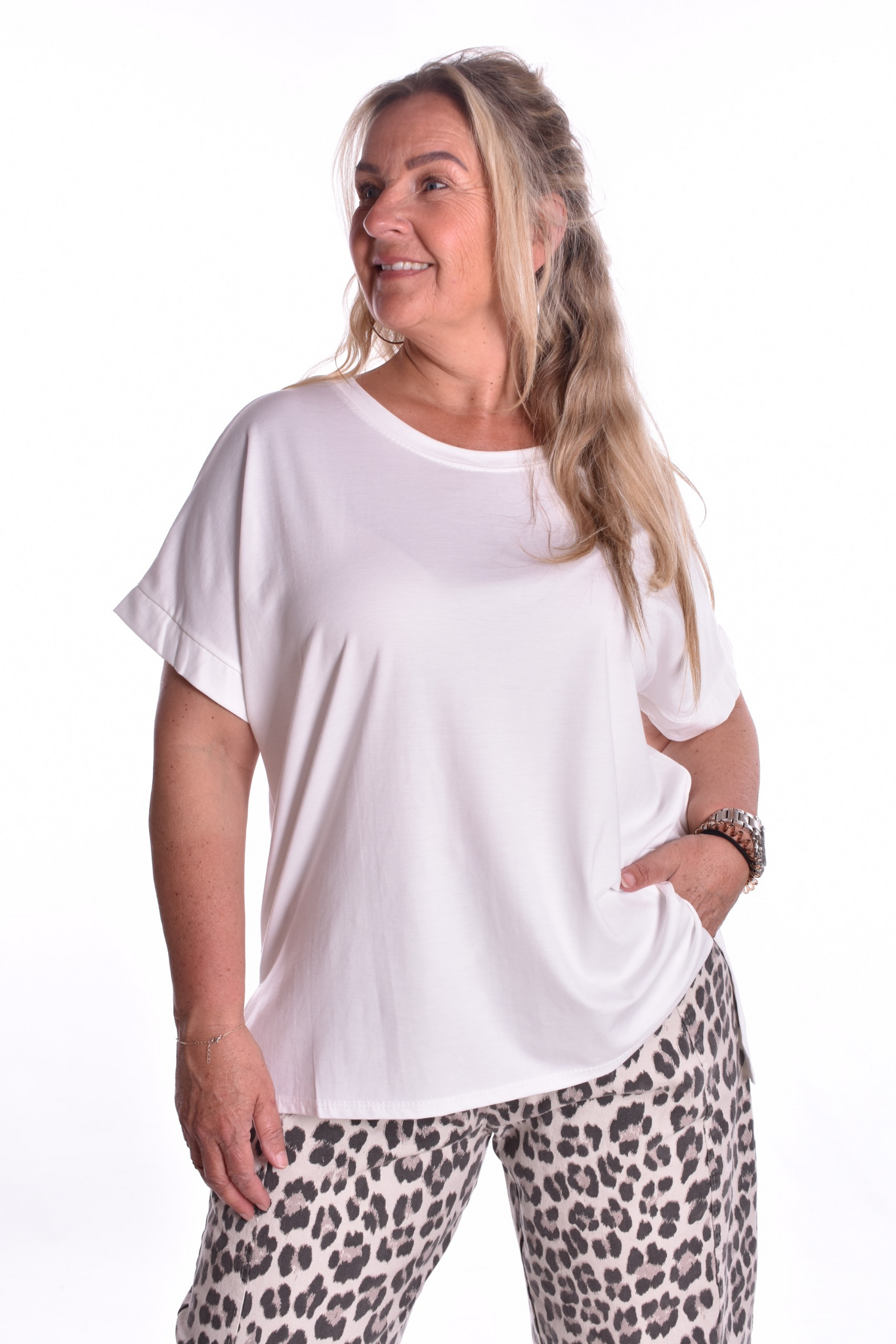 Ruimvallend shirt, met zij splitjes en een ronde hals. Het shirt is van viscose, dus lekker luchtig en niet zweterig.