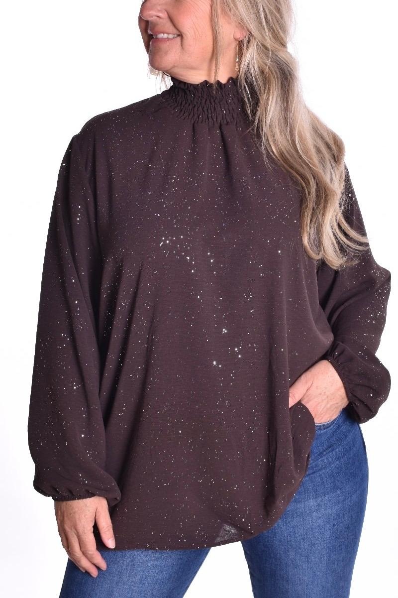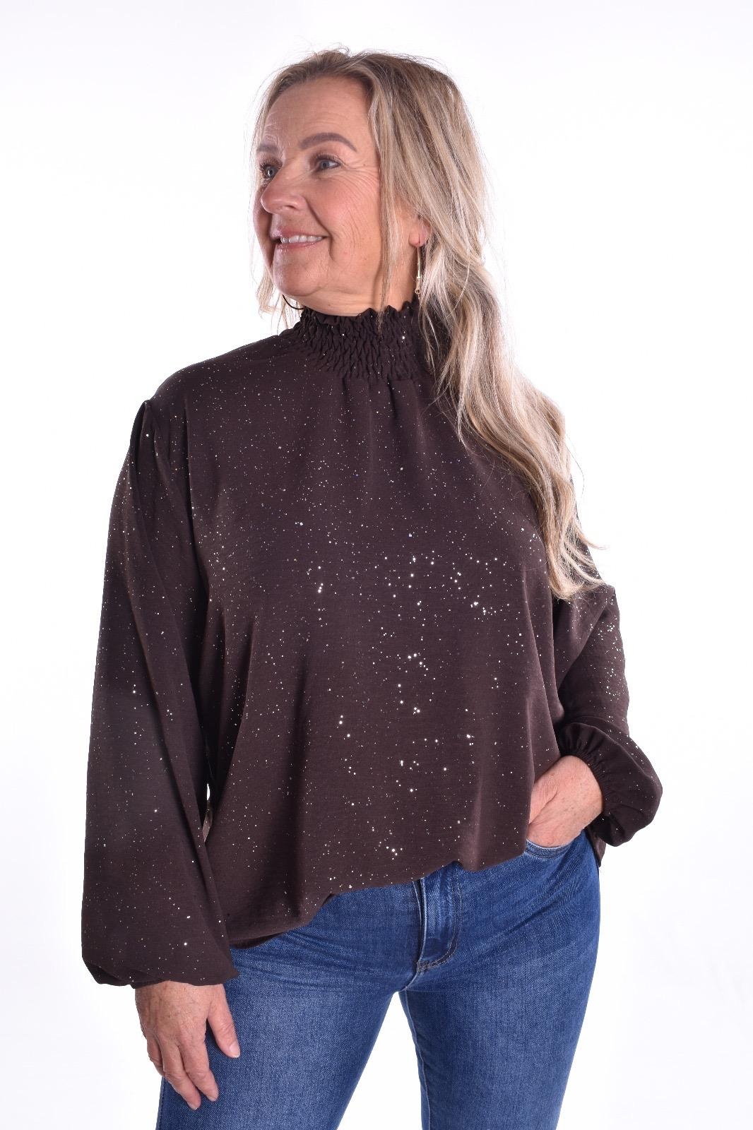 Een mooie top met een glittertje en een gesmokte nek. De top is one size te dagen van maat 40 t/m maat 46.