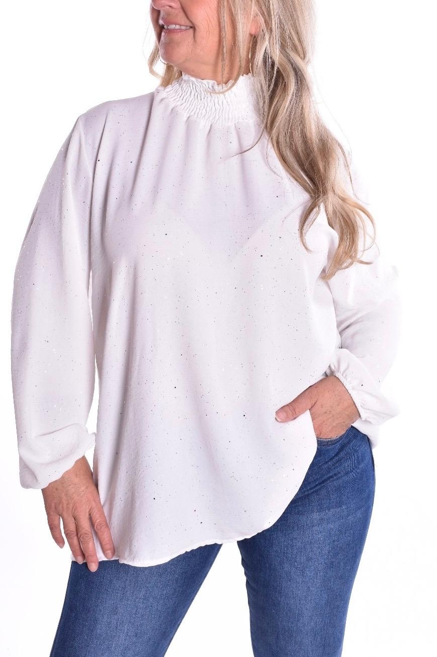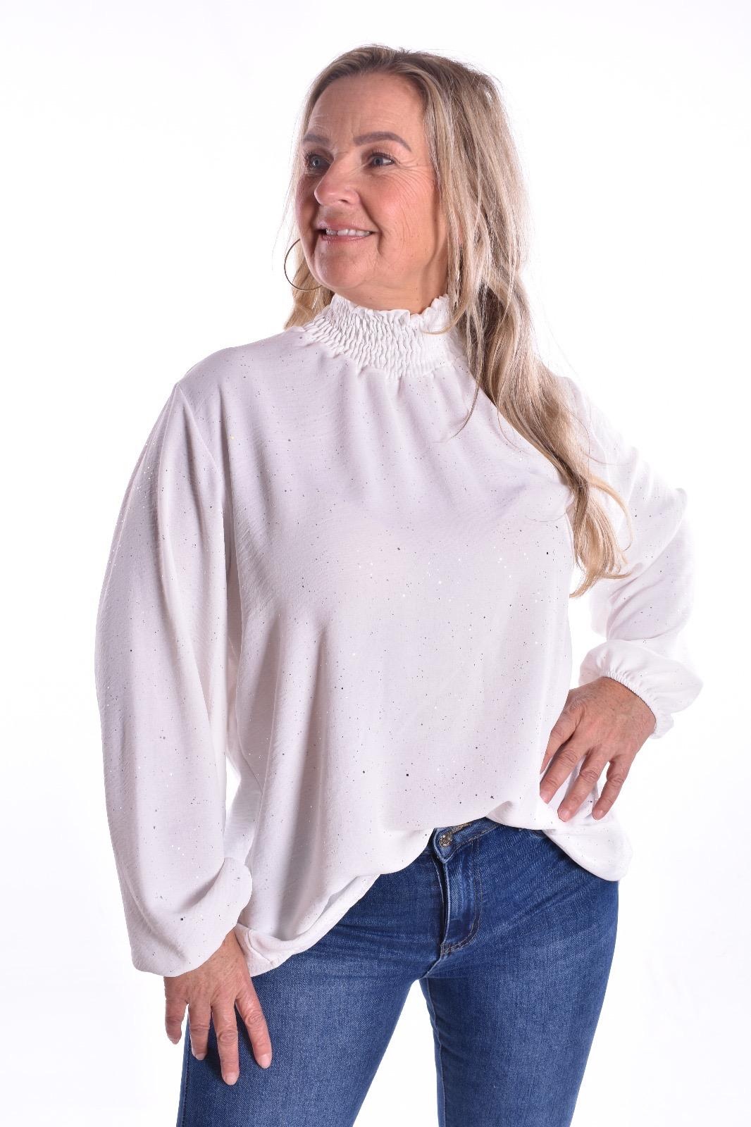 Een mooie top met een glittertje en een gesmokte nek. De top is one size te dagen van maat 40 t/m maat 46.