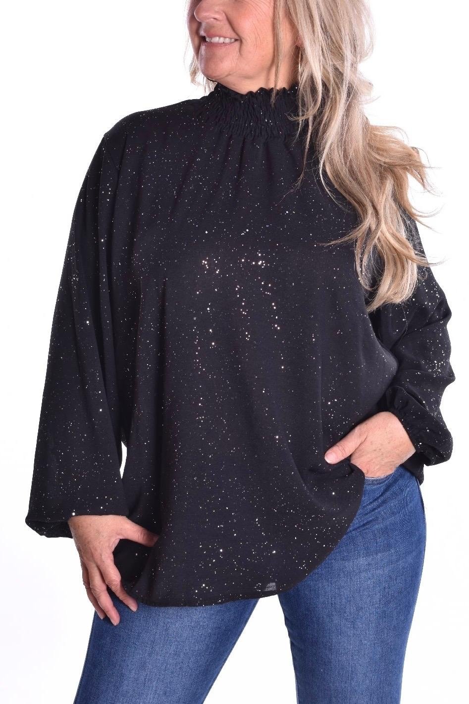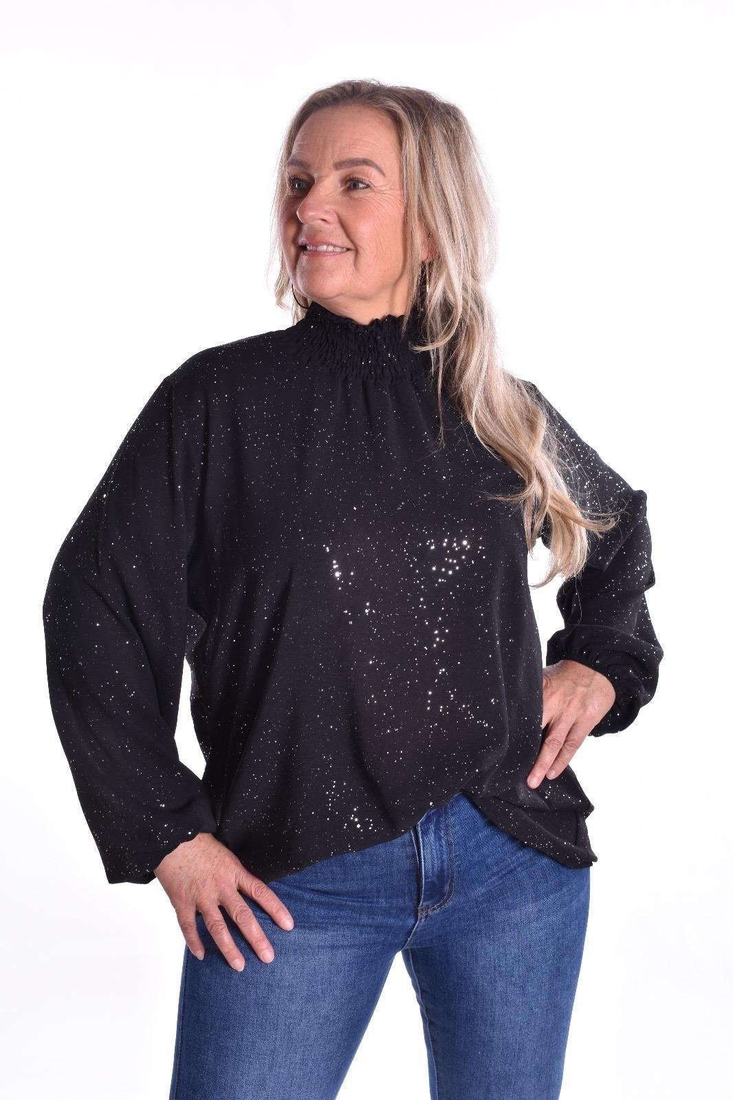 Een mooie top met een glittertje en een gesmokte nek. De top is one size te dagen van maat 40 t/m maat 46.