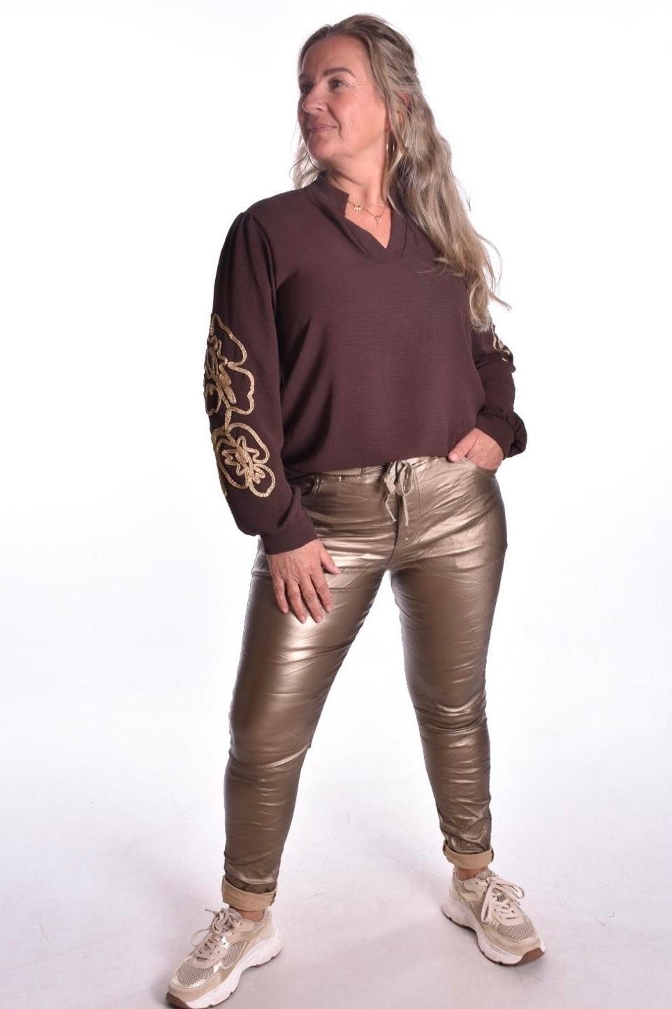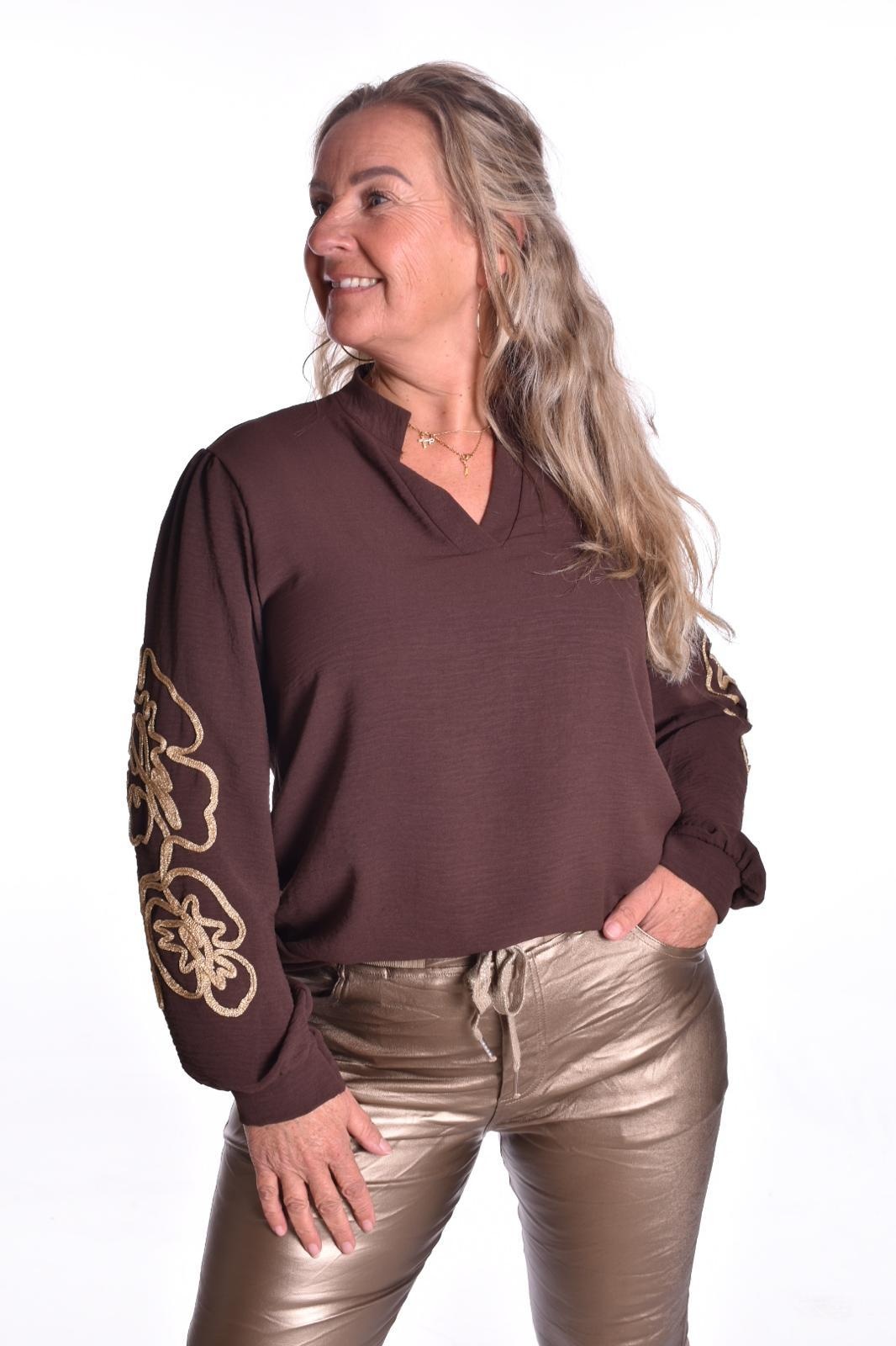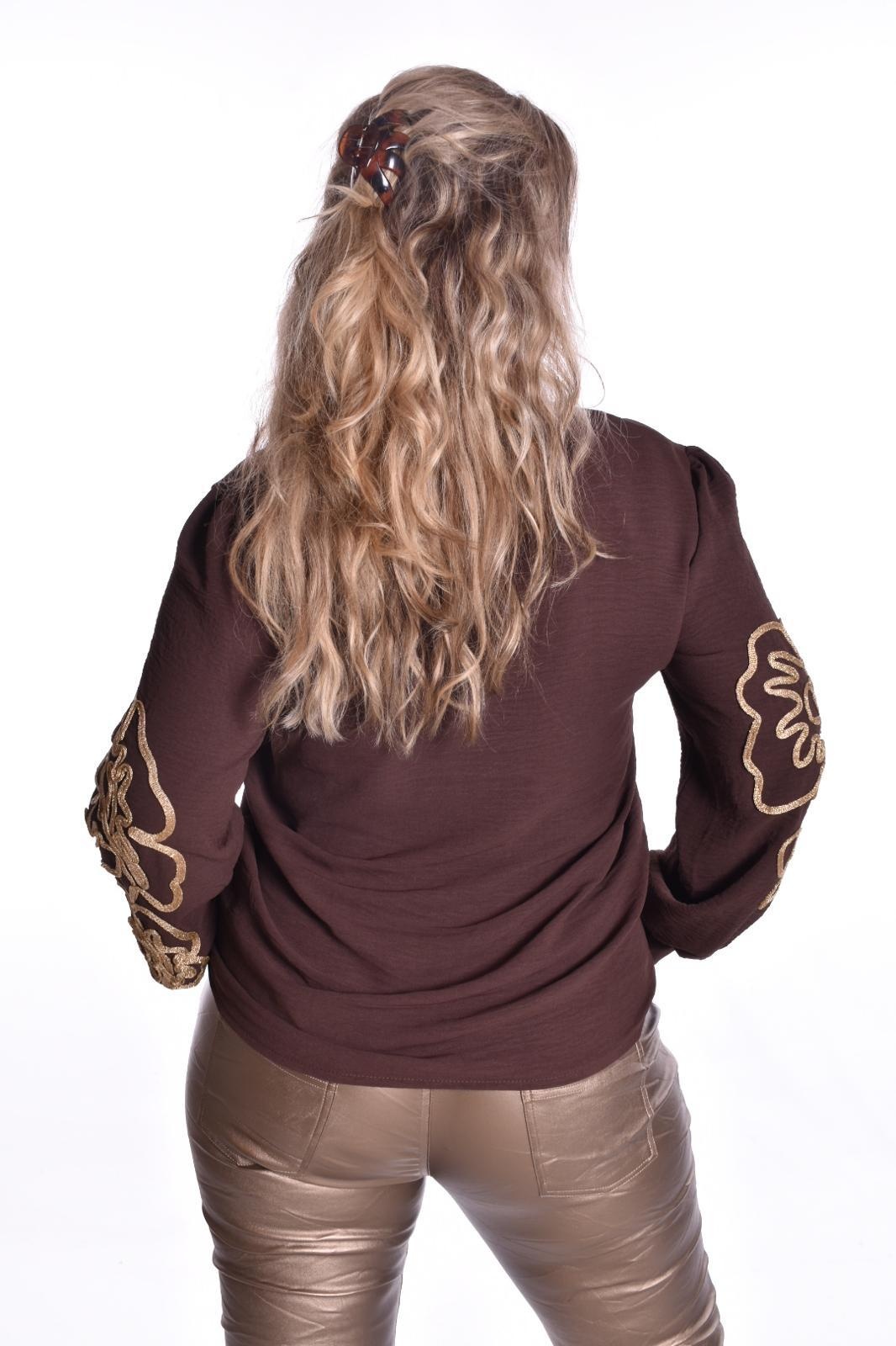 Top met goudkleurig koord geborduurd op de mouwen.