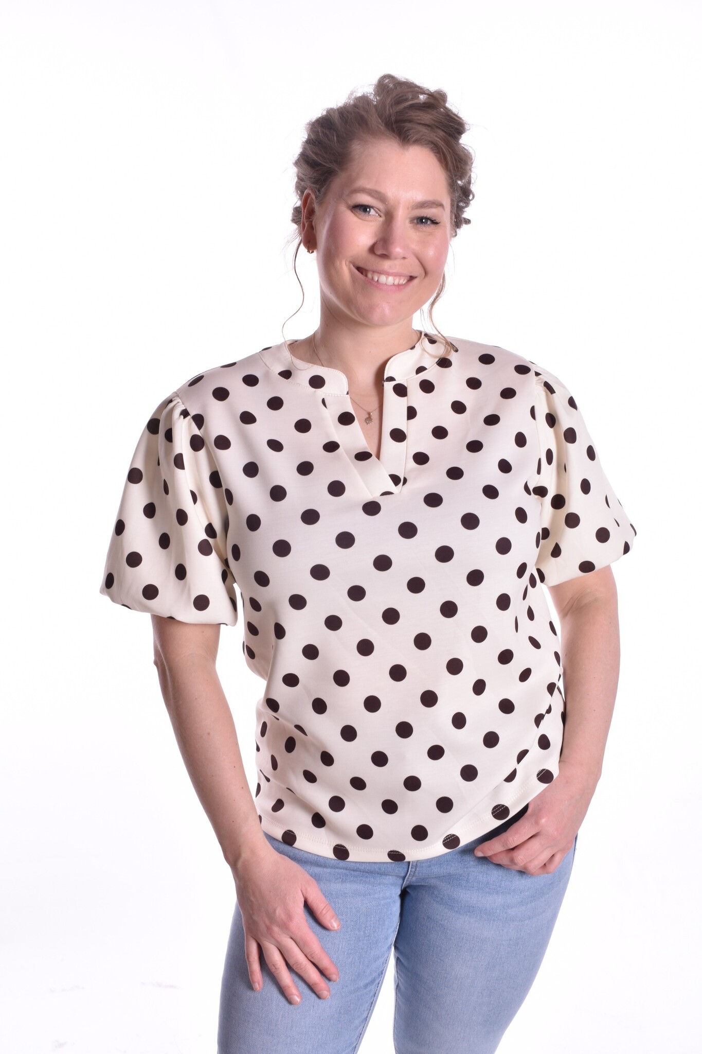Luxe travelstof top met pofmouwtjes en de bekende Polka dot.