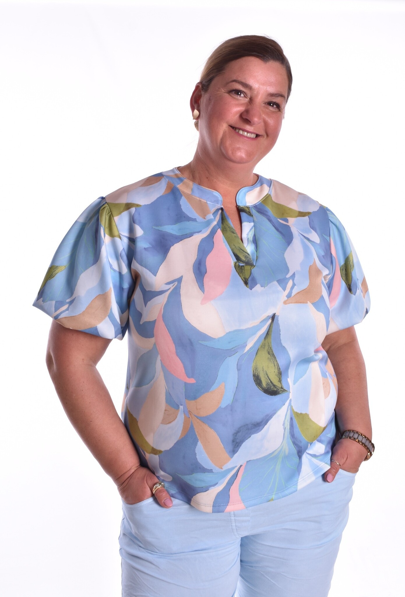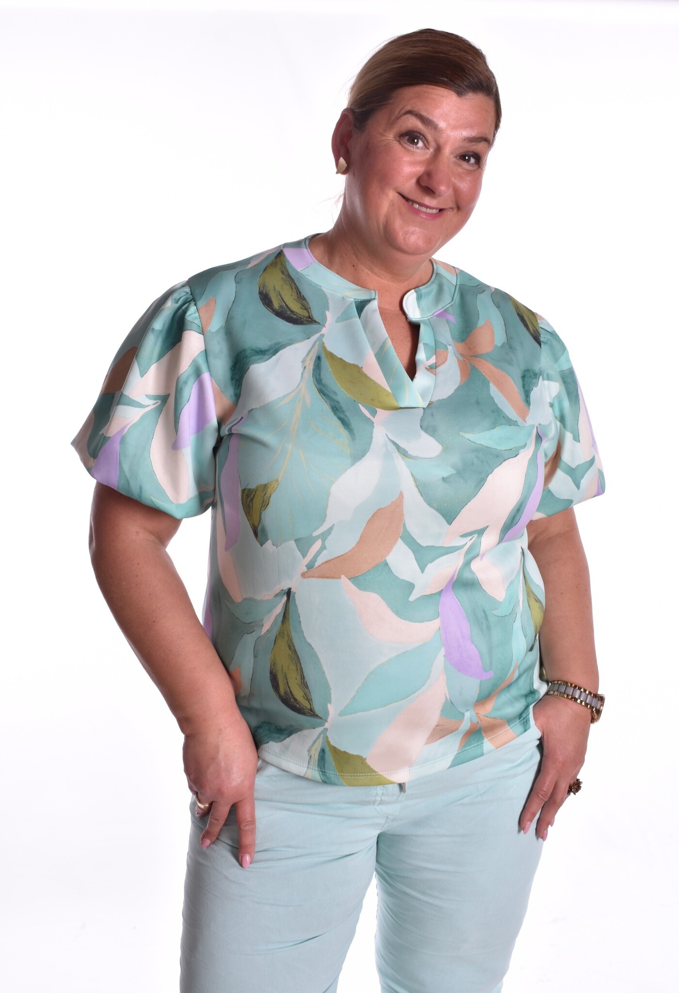 Top van een zachte stof met pofmouwtjes en een V-hals.