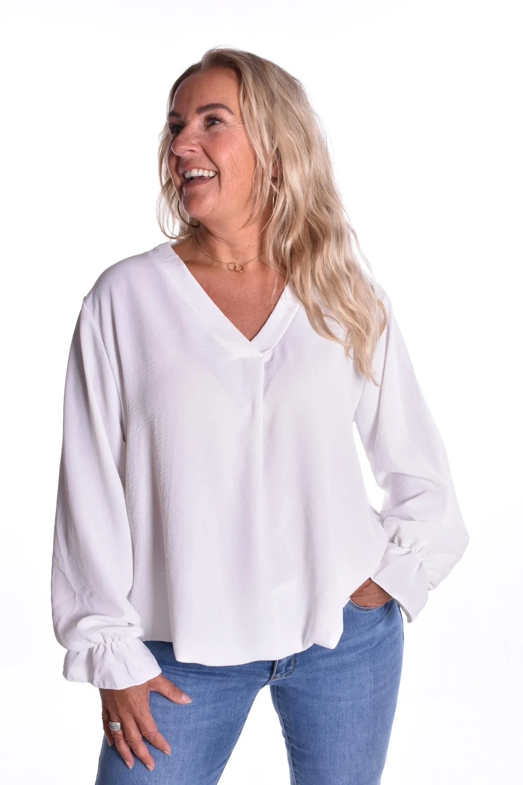 De top is er in een maat en kan gedragen worden van maat 40 t/m maat 46.