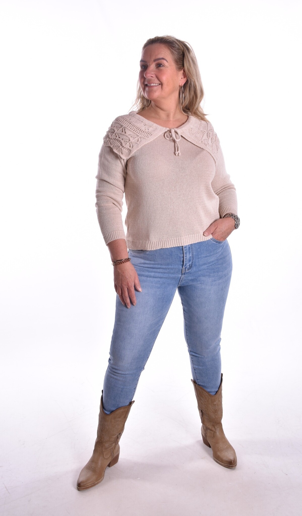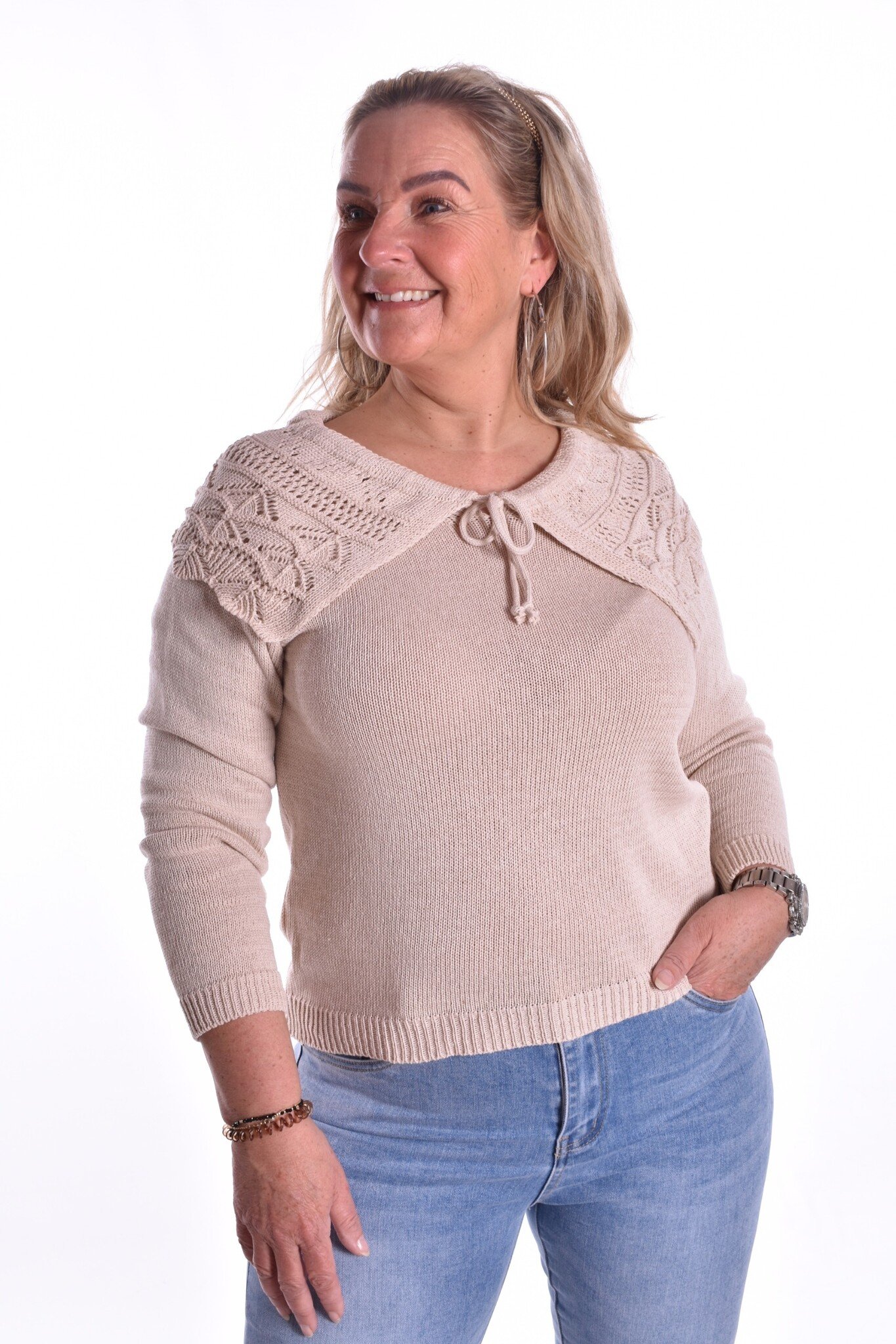 Top Bobby is een gebreide/ gehaakte top met opengewerkte grote kraag.