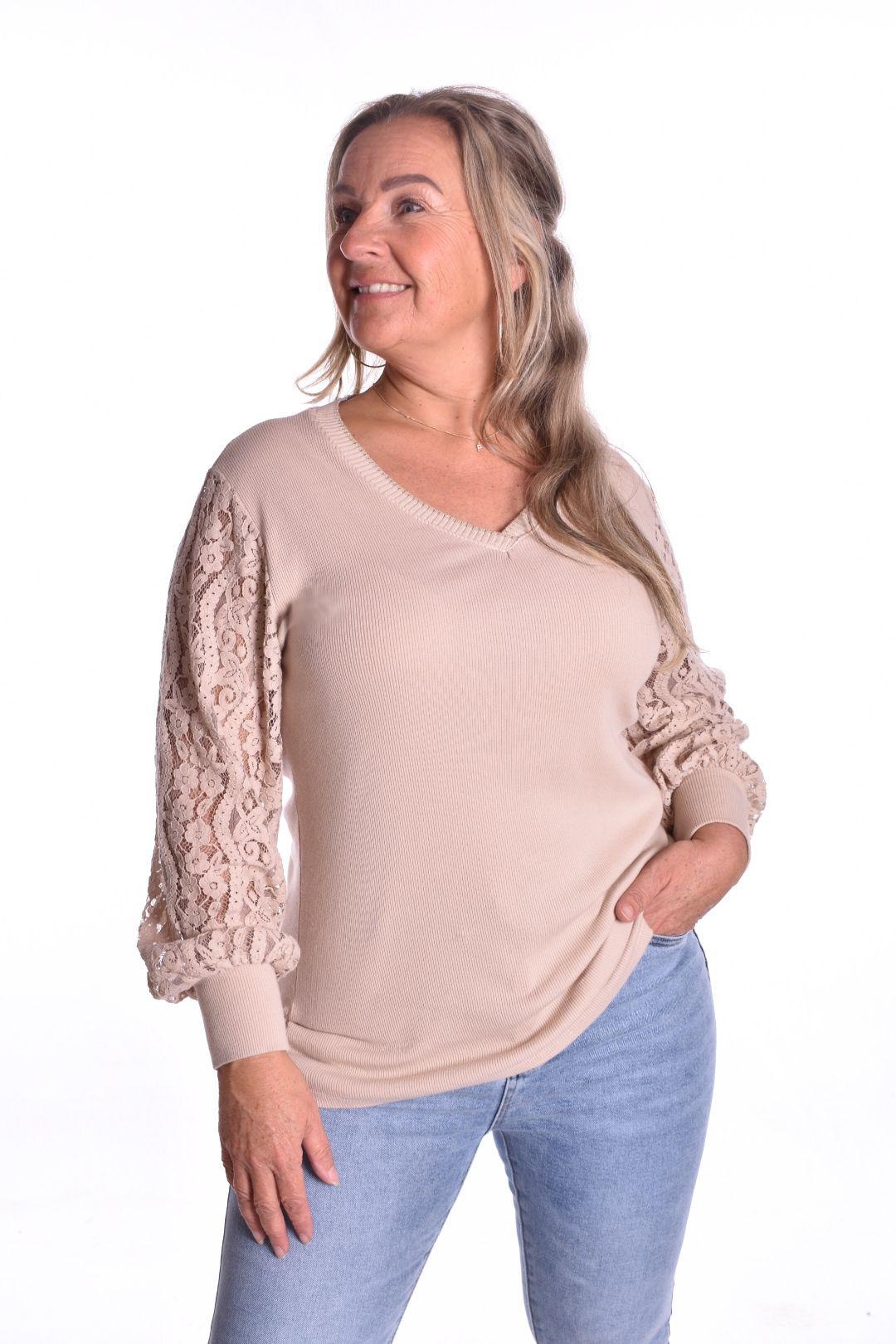 Top Macy is een kanten top met een klein ribbeltje en kanten mouwen en V-hals.