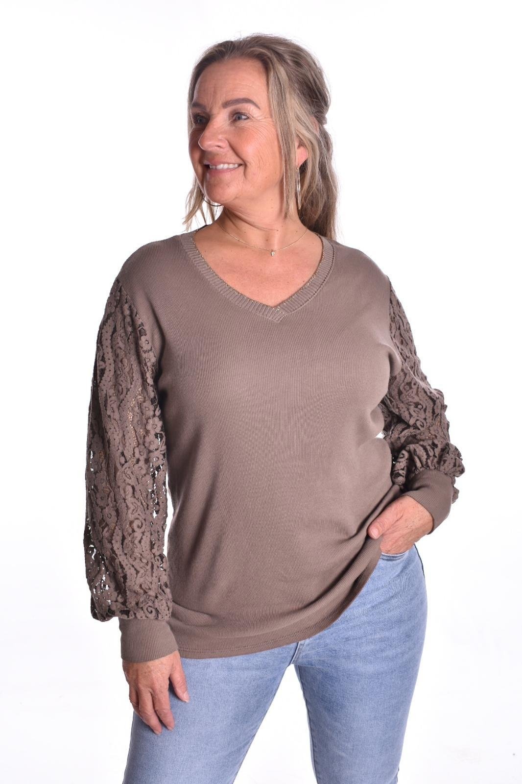 Top Macy is een kanten top met een klein ribbeltje en kanten mouwen en V-hals.