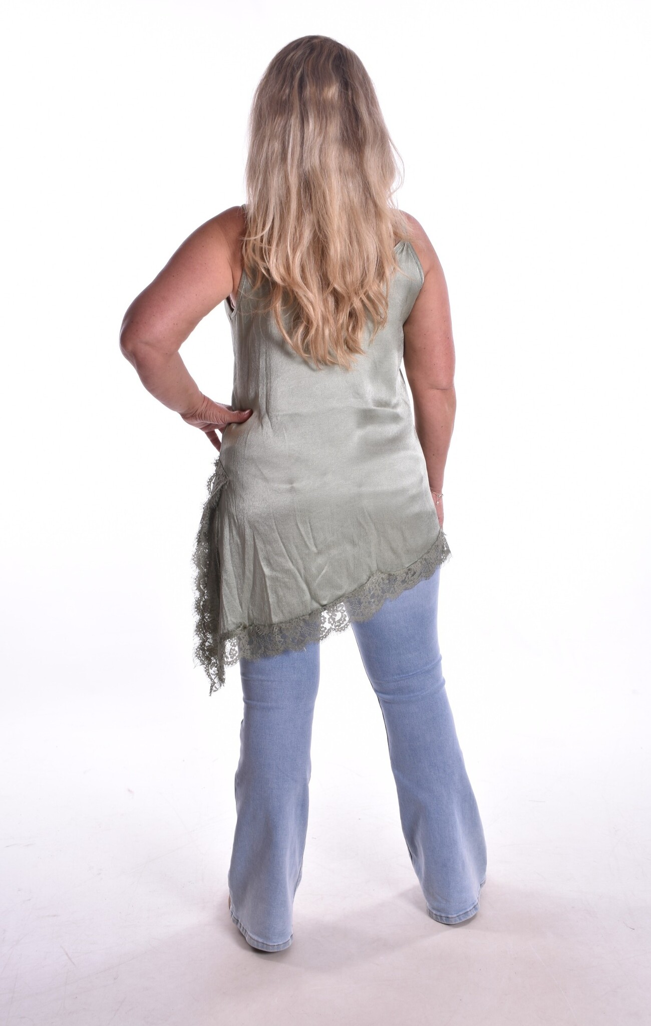 De top is A- symmetrisch met een kanten schuine onderkant. En een V-hals.