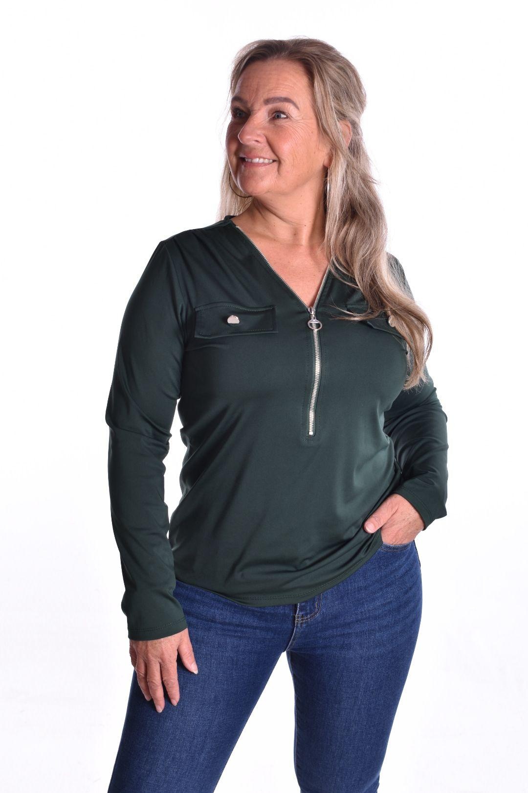 Luxe Travelstof top met 2 sier klepzakjes op de borst en een rits.