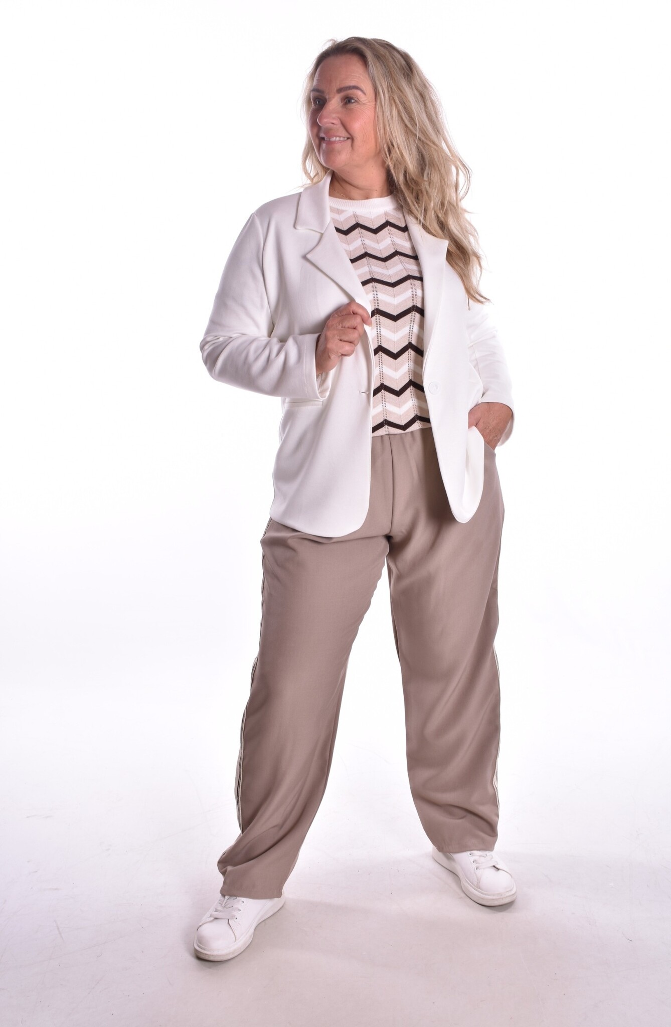 In beige-bruin tinten top van heel fijn breisel in zigzag patroon.