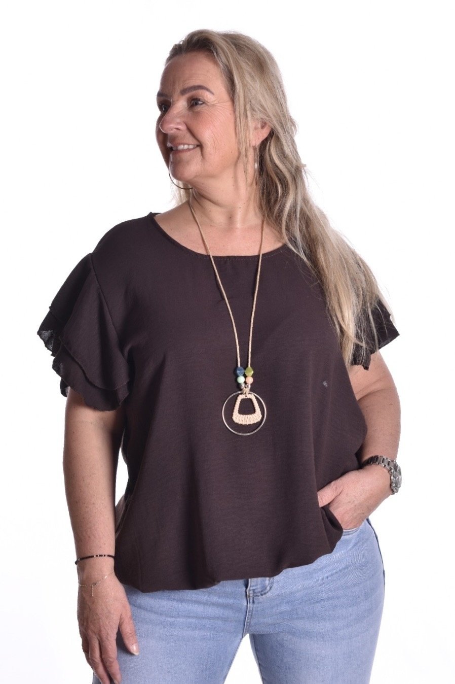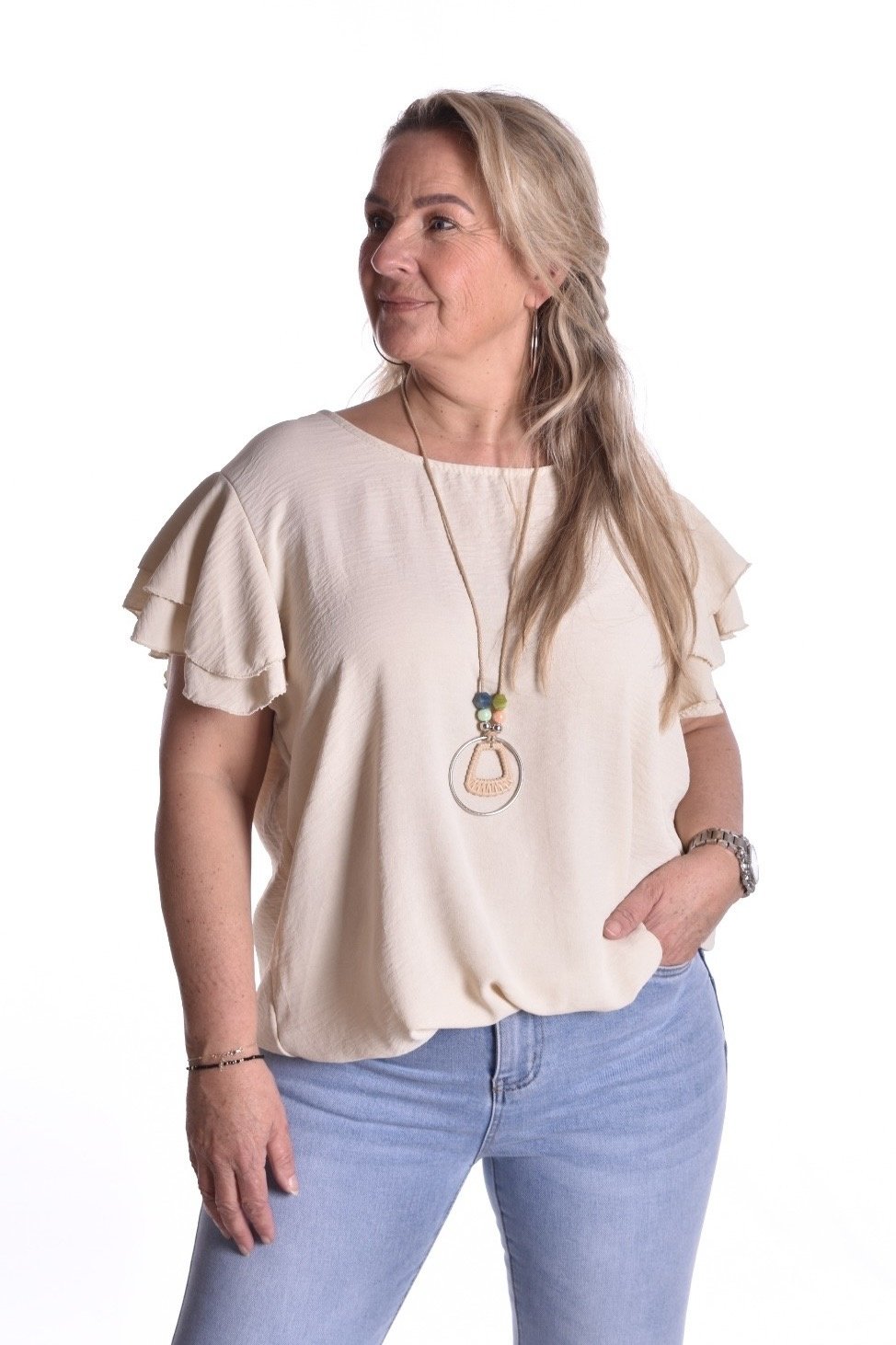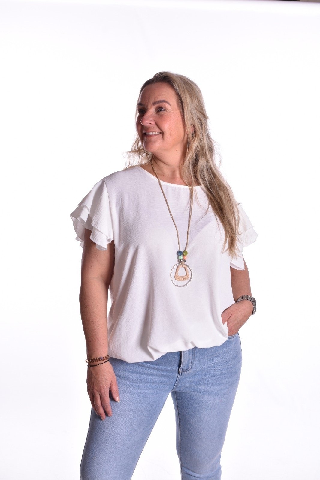 De top Romy heeft elastiek aan de onderkant en ruffle mouwen en is inclusief ketting!