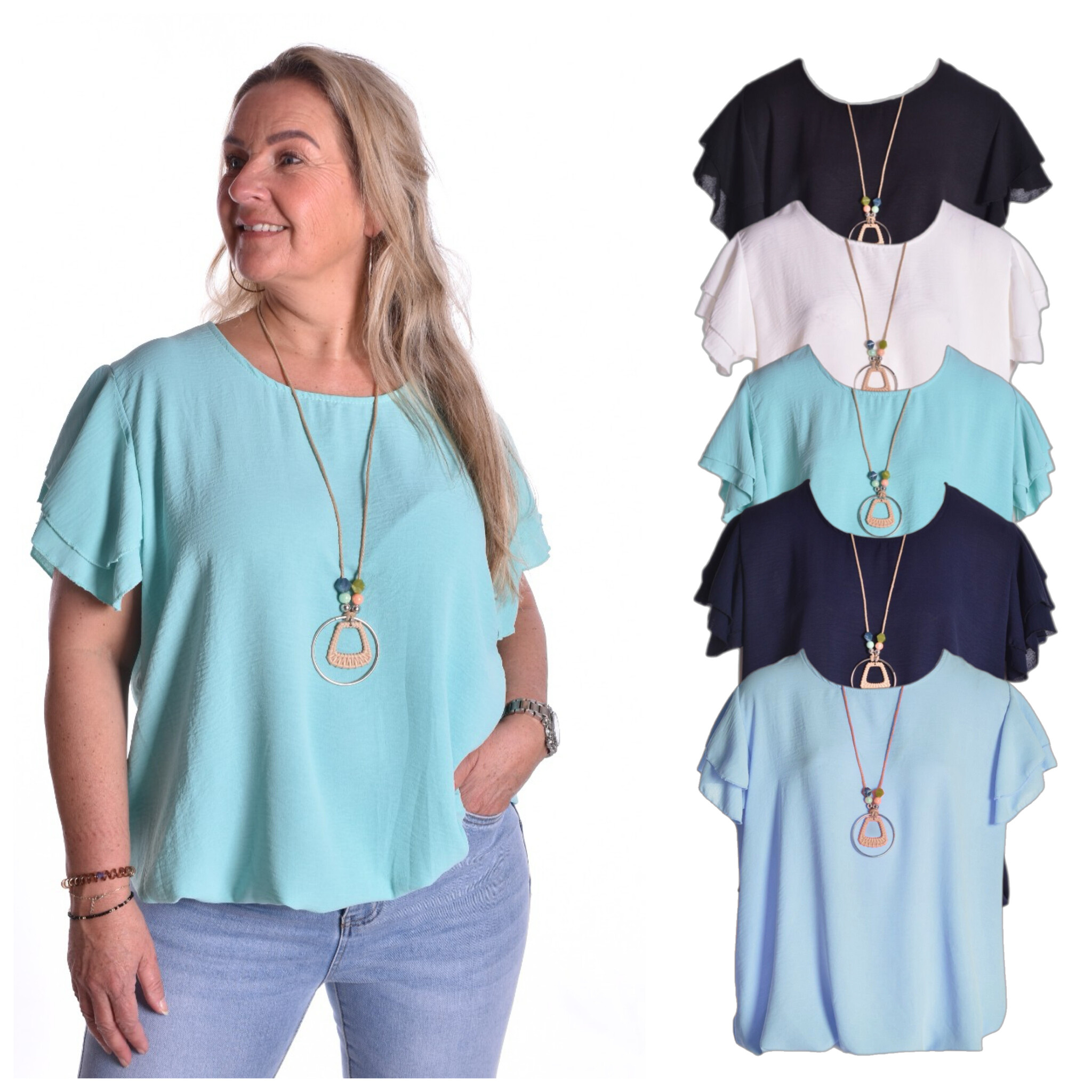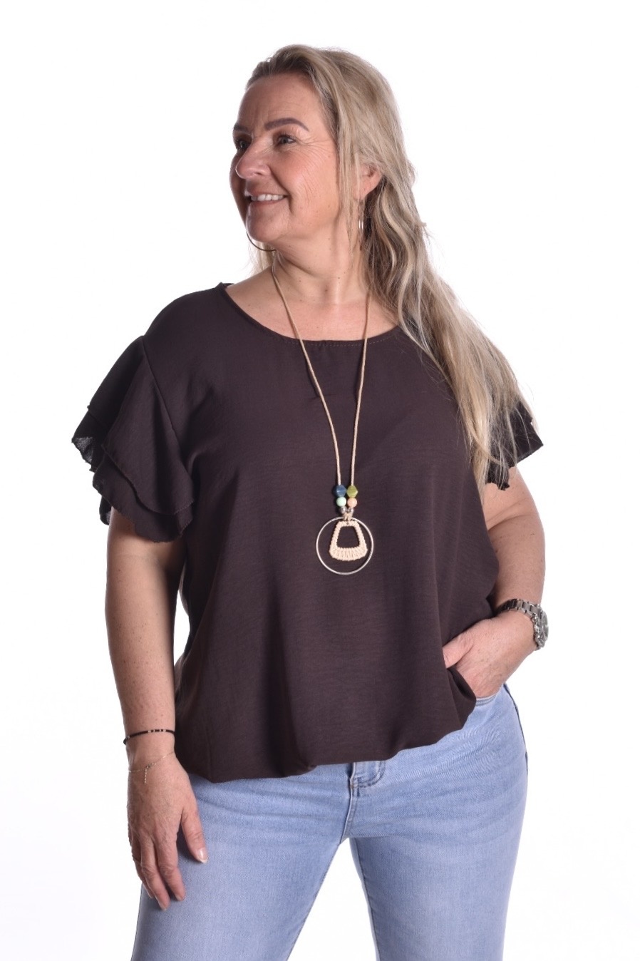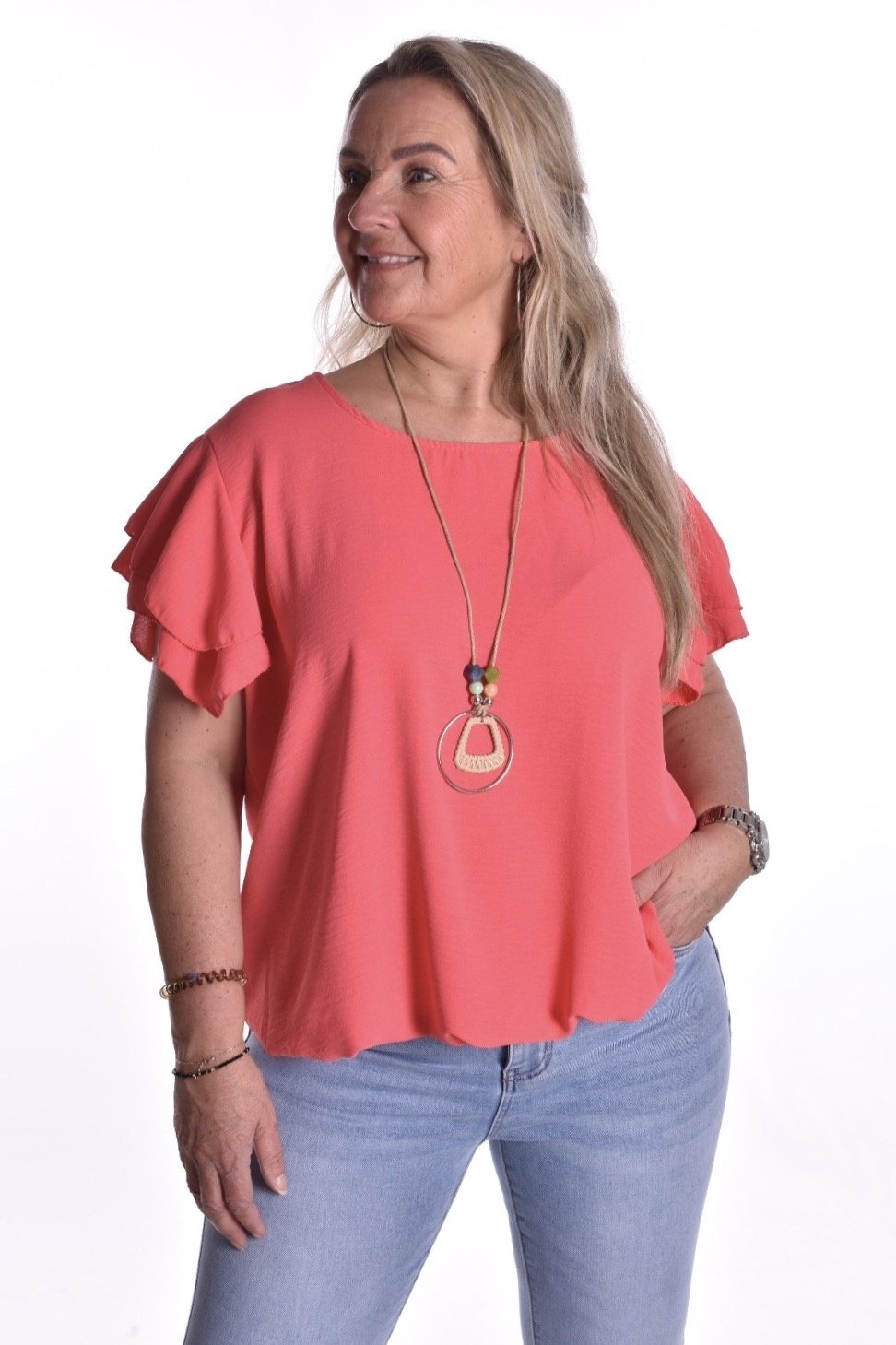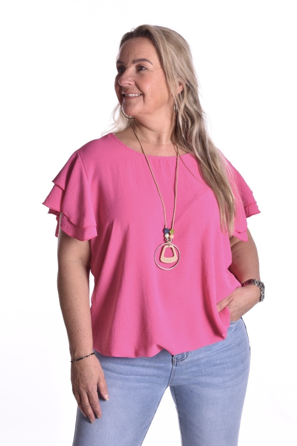 De top Romy heeft elastiek aan de onderkant en ruffle mouwen en is inclusief ketting!