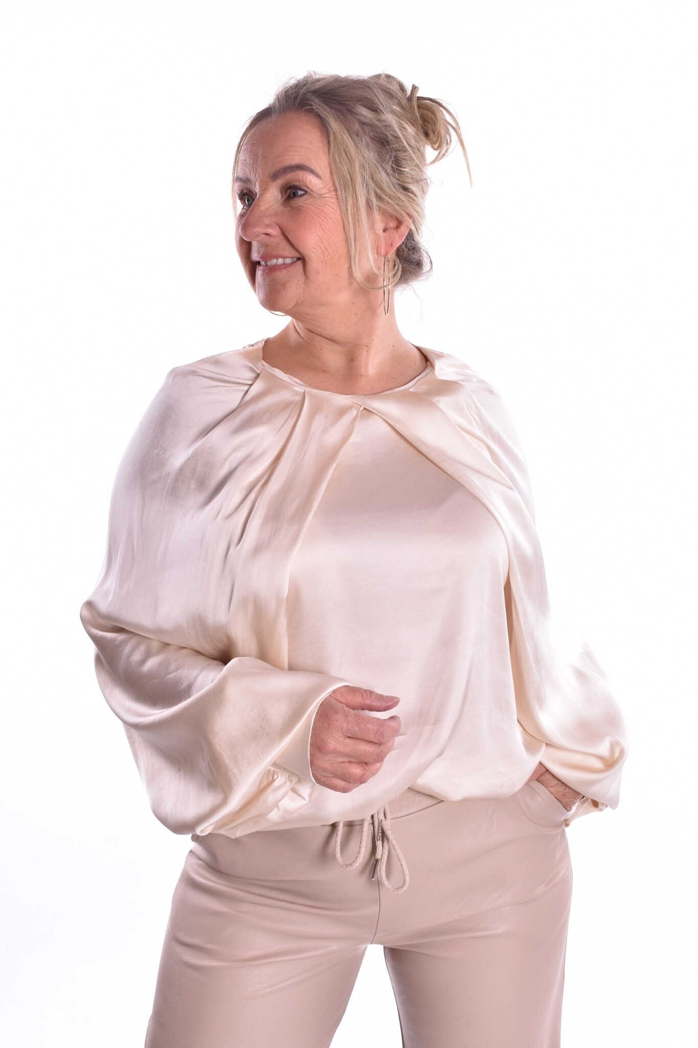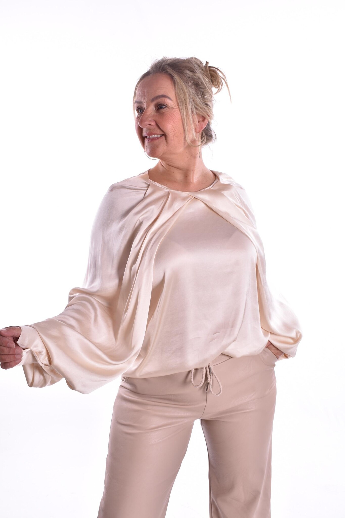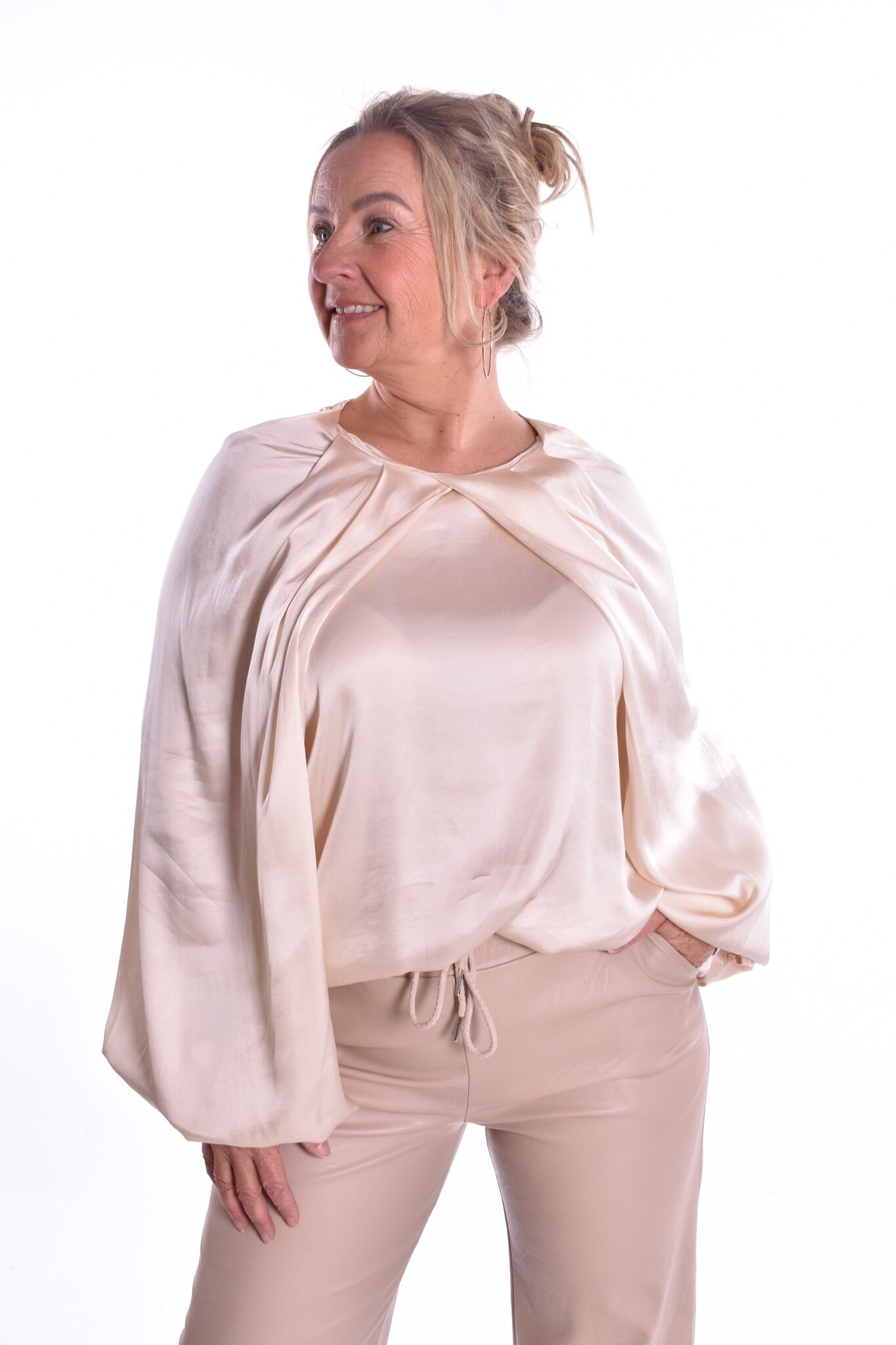 Top Satin Love is van een mooie kwaliteit, satijn look, plooi top met overslag mouwen, de manchetten hebben een knoopsluiting.