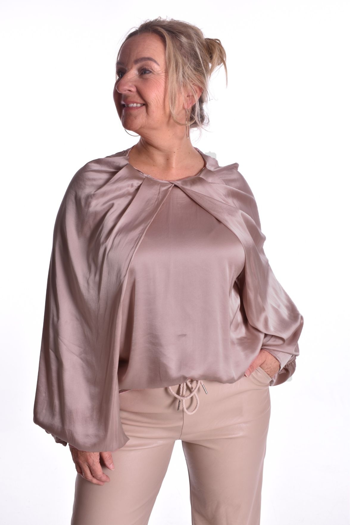 Top Satin Love is van een mooie kwaliteit, satijn look, plooi top met overslag mouwen, de manchetten hebben een knoopsluiting.