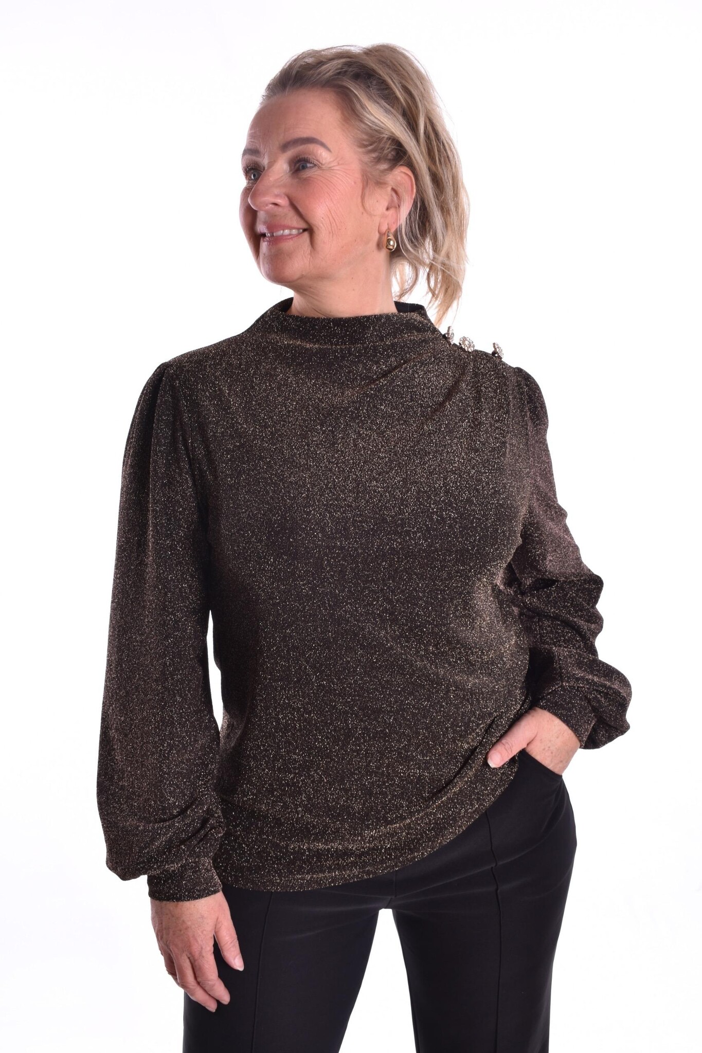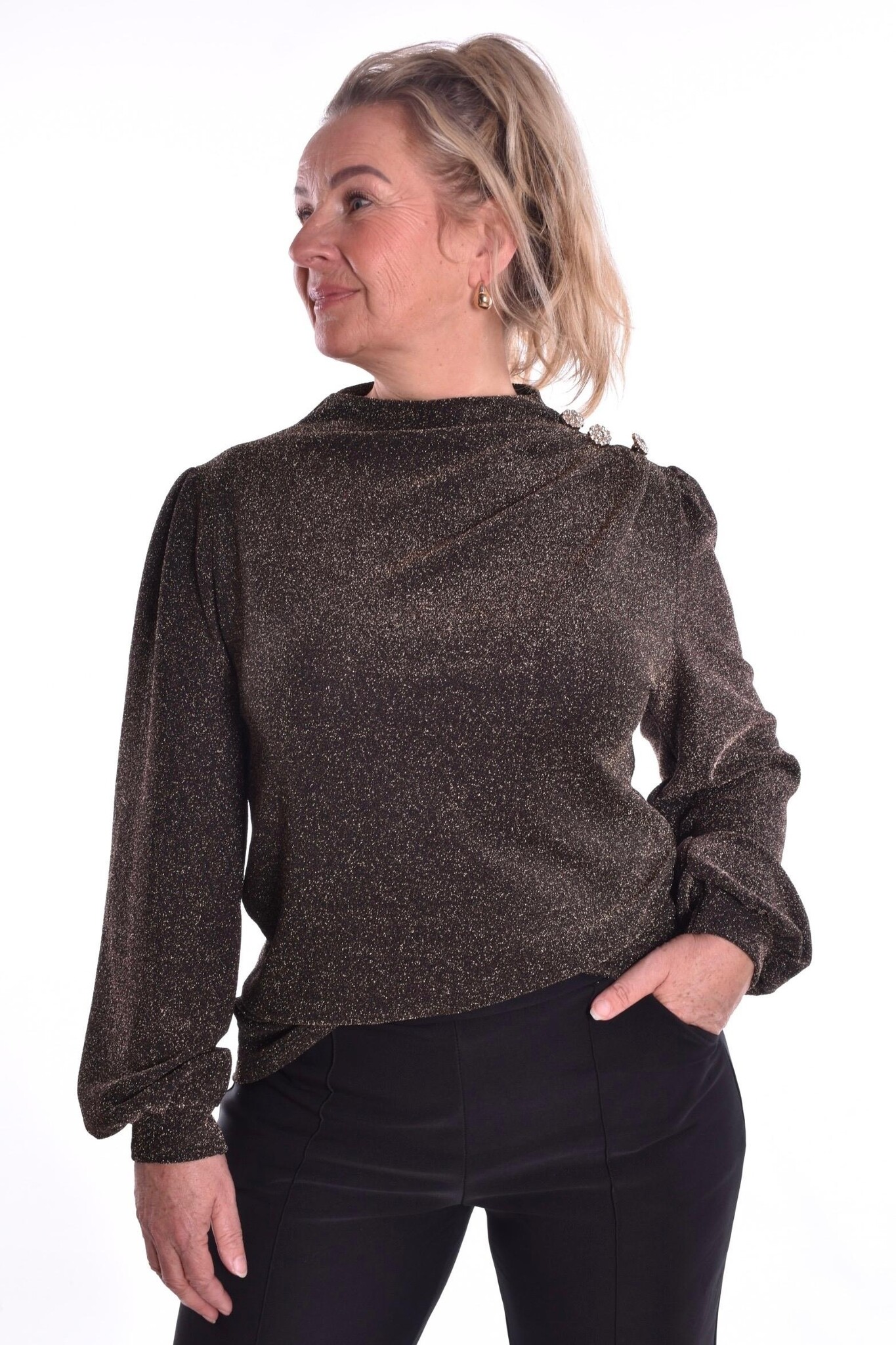 Top Sparkle is een zachte stretch top met glittertjes en sierknoopjes op de schouders.