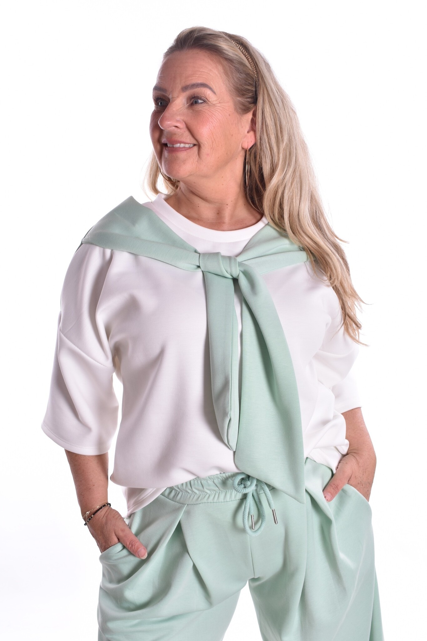 De top is een maat en is te dragen t/m maat 44. De top is leuk te combineren bij de broek Tess.