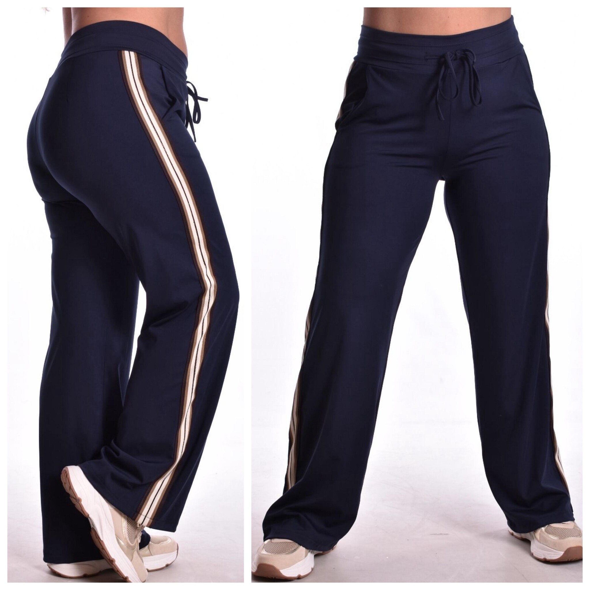 De broek is gemaakt van een heerlijke travelstof, heeft twee steekzakken, in de taille zit een aanrijgkoord en heeft een luxe bies op de zijkant.