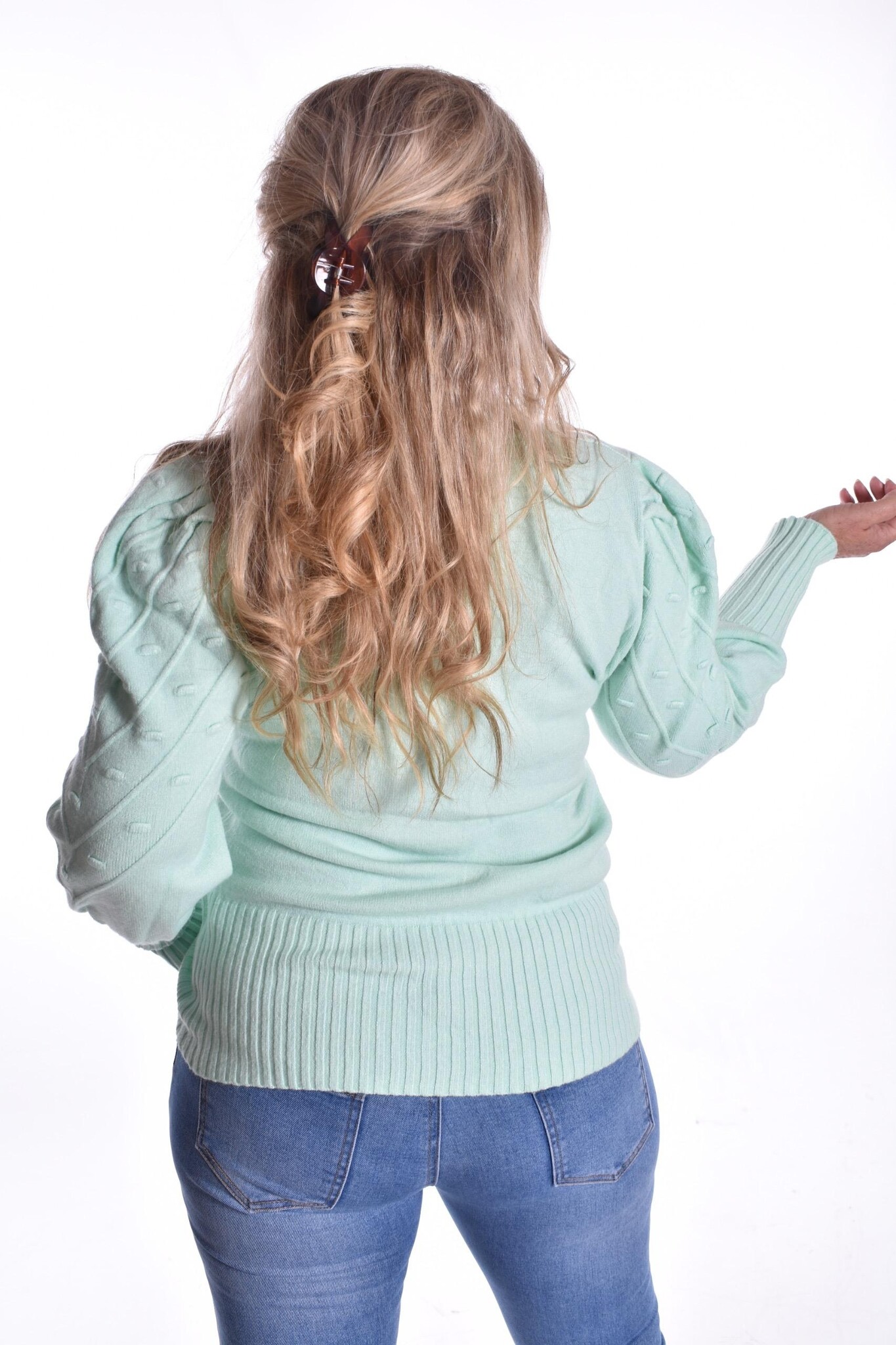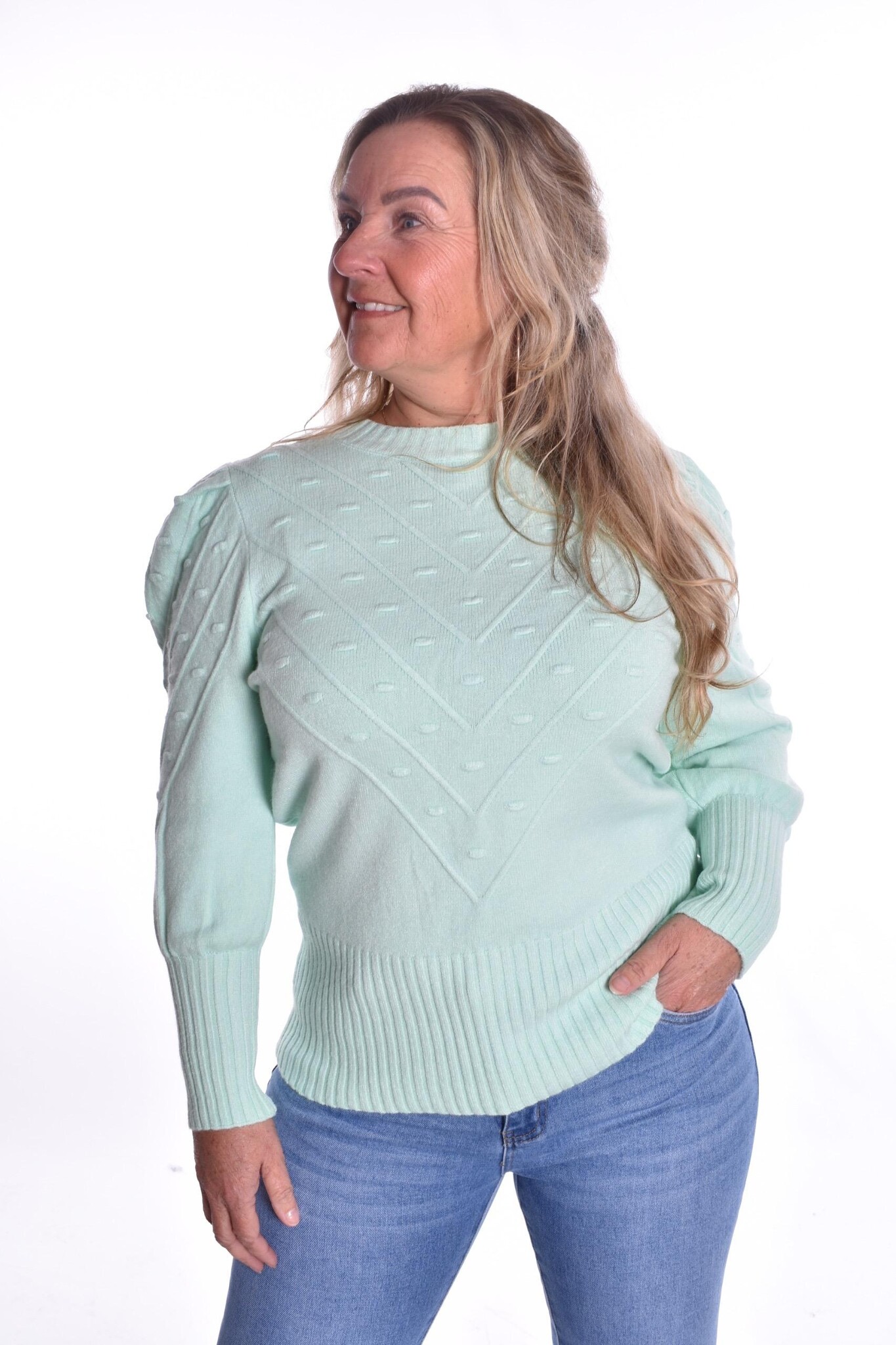 De trui Debbie is een zachte gebreide trui met pofschouders, ronde hals, breed boor en brede manchetten. De trui is er in één maat en wij adviseren dat de trui te dragen is t/m maat 44.