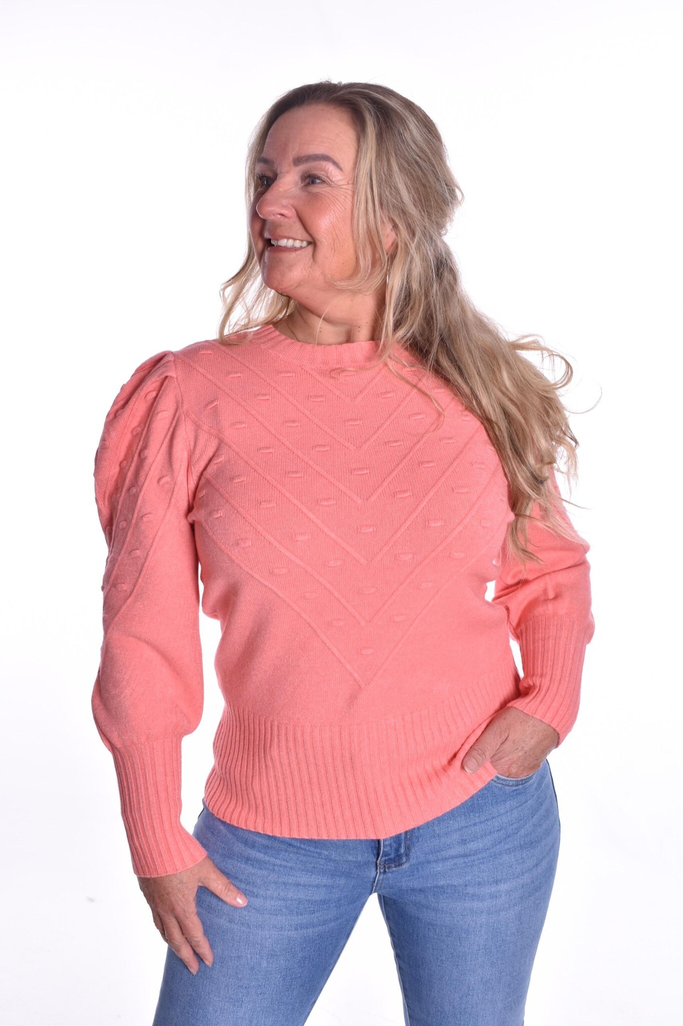 De trui Debbie is een zachte gebreide trui met pofschouders, ronde hals, breed boor en brede manchetten. De trui is er in één maat en wij adviseren dat de trui te dragen is t/m maat 44.