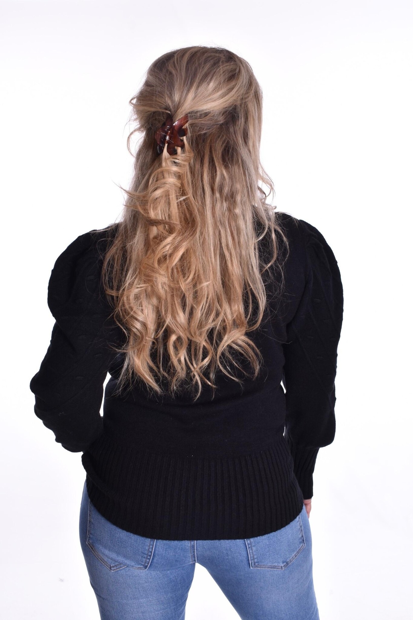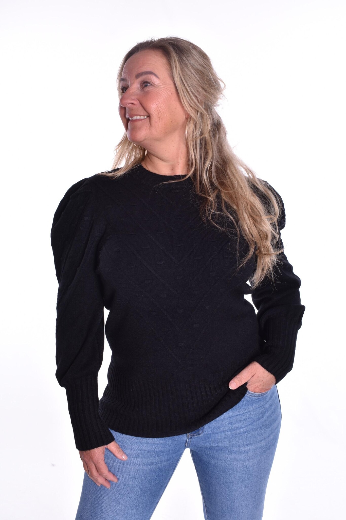 De trui Debbie is een zachte gebreide trui met pofschouders, ronde hals, breed boor en brede manchetten. De trui is er in één maat en wij adviseren dat de trui te dragen is t/m maat 44.