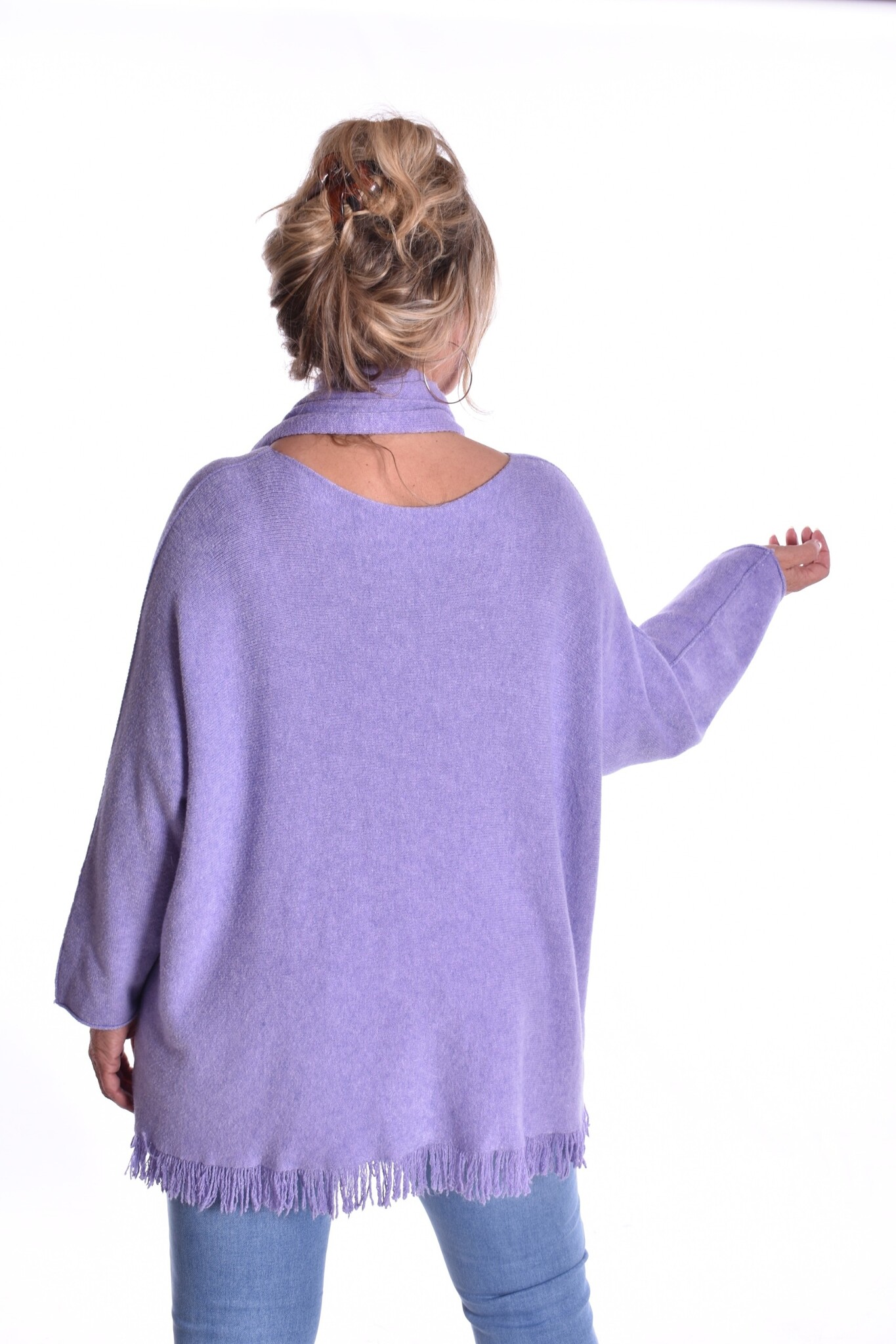 Fijn gebreide trui van zacht breisel met bijpassende sjaal. De trui heeft leuke franjes aan de onderkant.