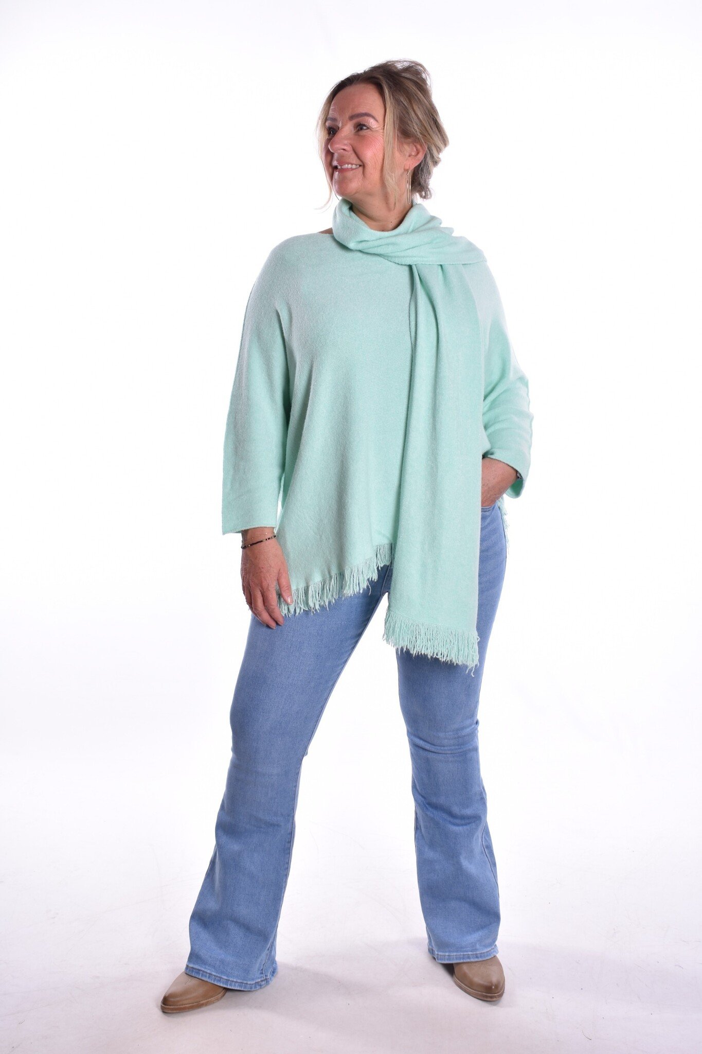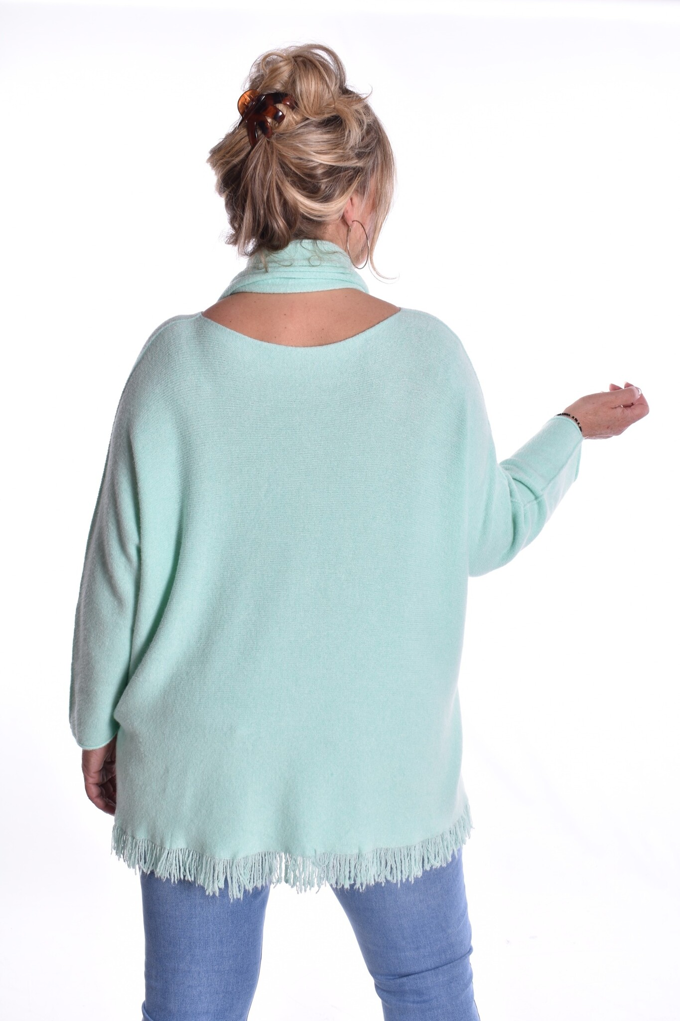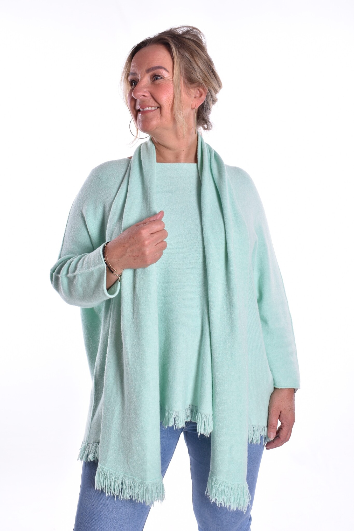 Fijn gebreide trui van zacht breisel met bijpassende sjaal. De trui heeft leuke franjes aan de onderkant.