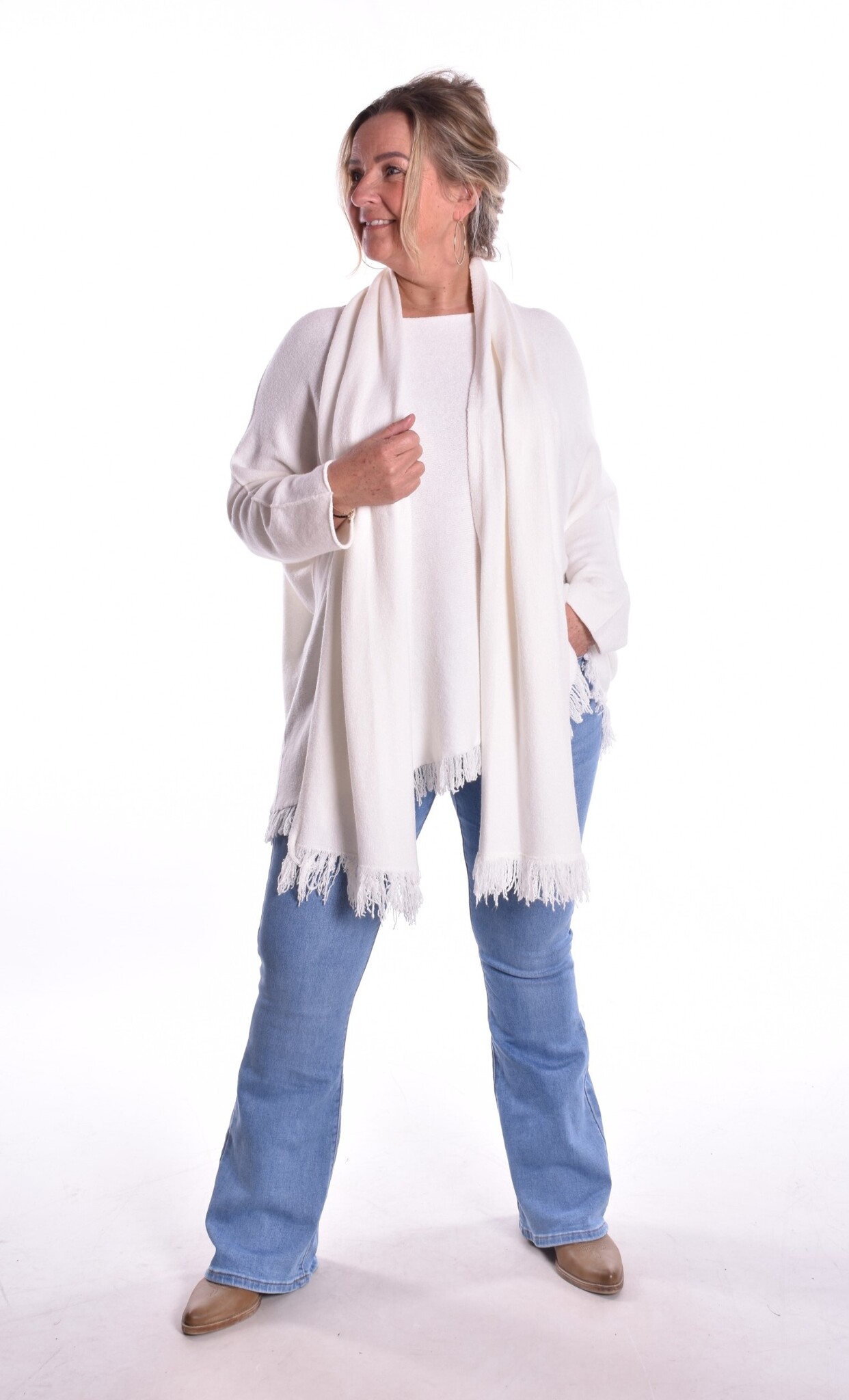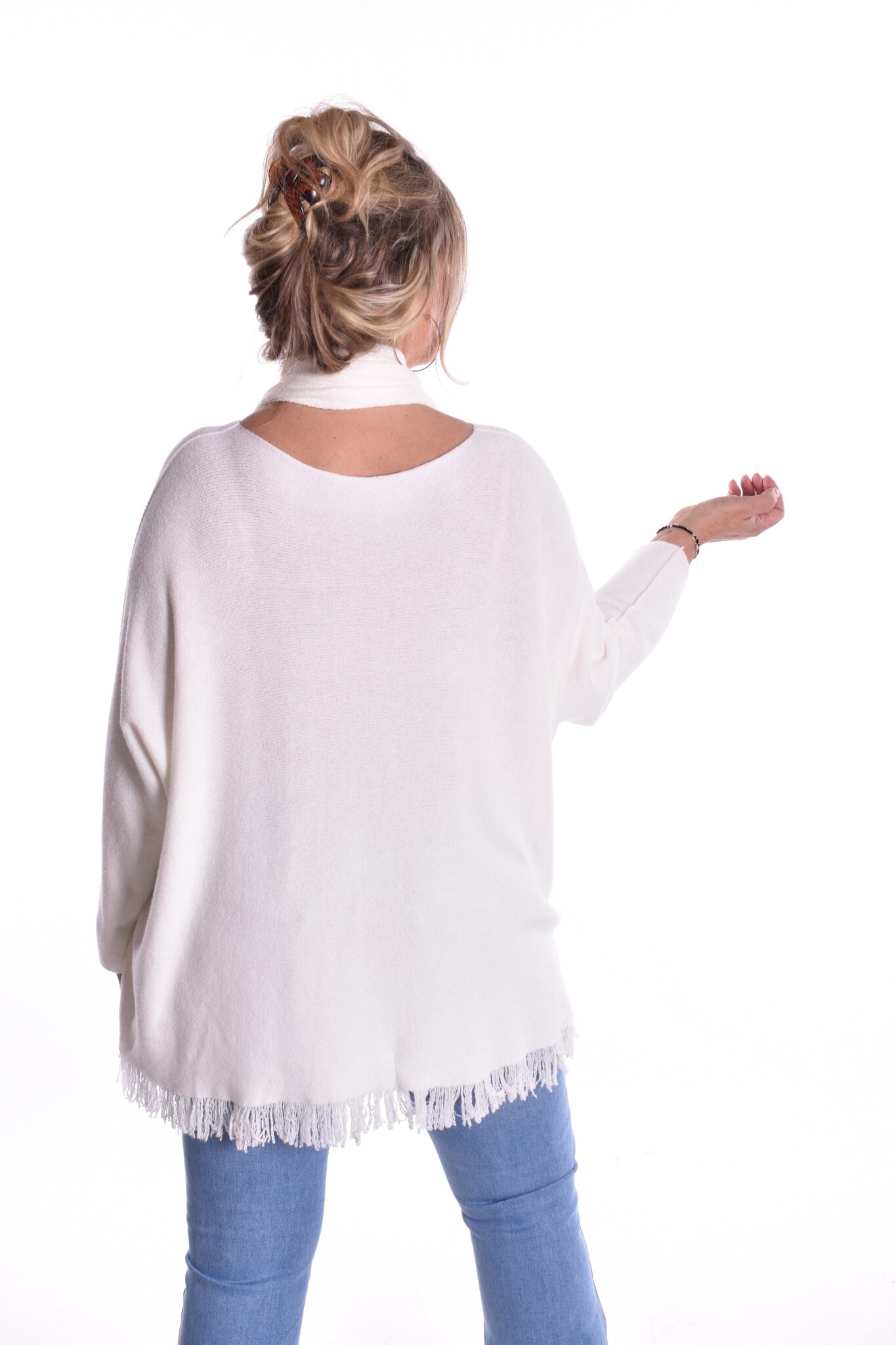 Fijn gebreide trui van zacht breisel met bijpassende sjaal. De trui heeft leuke franjes aan de onderkant.