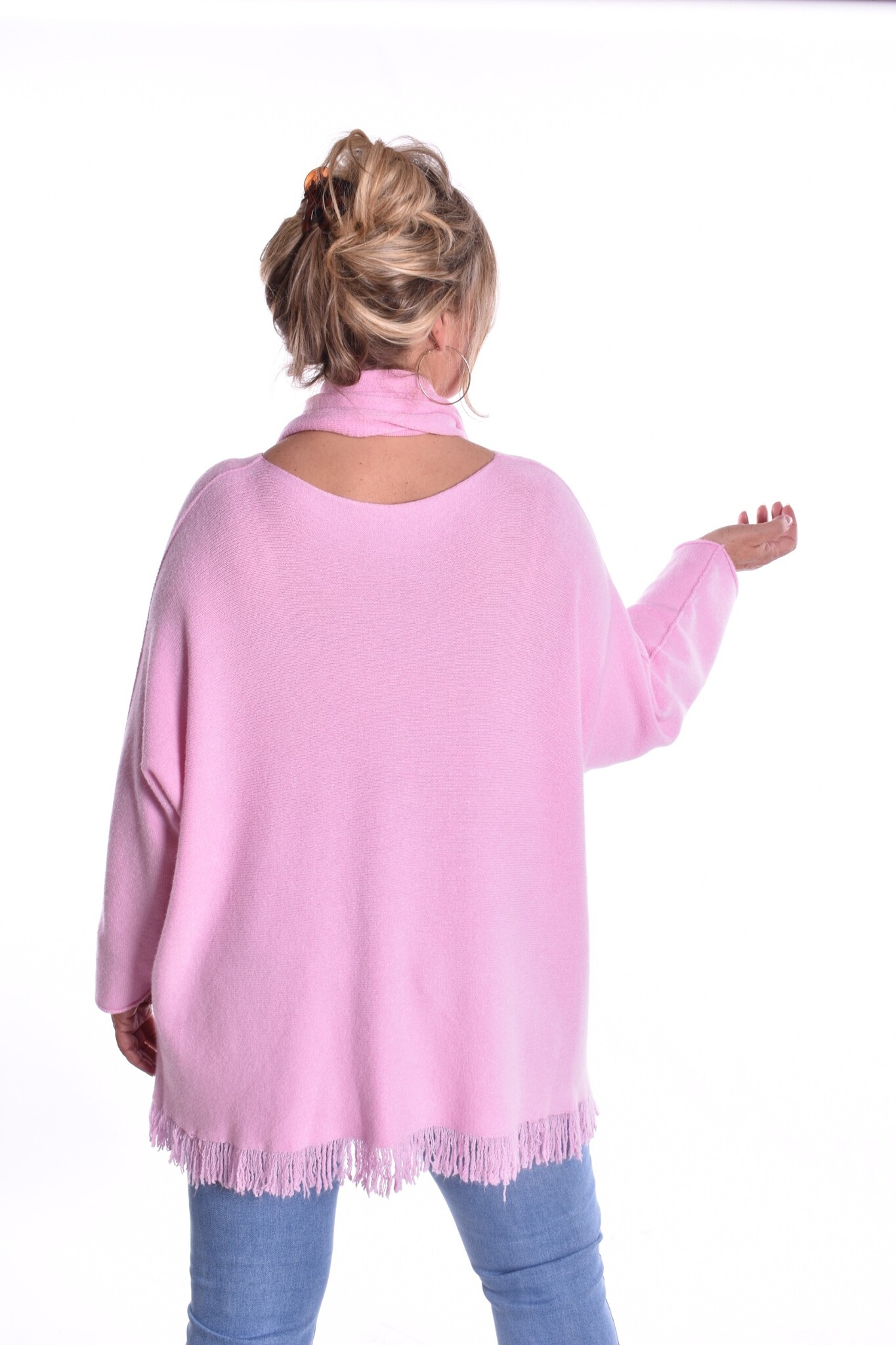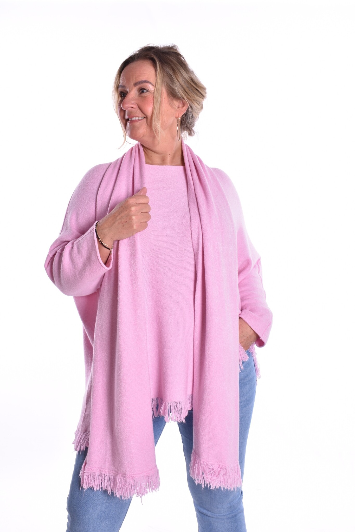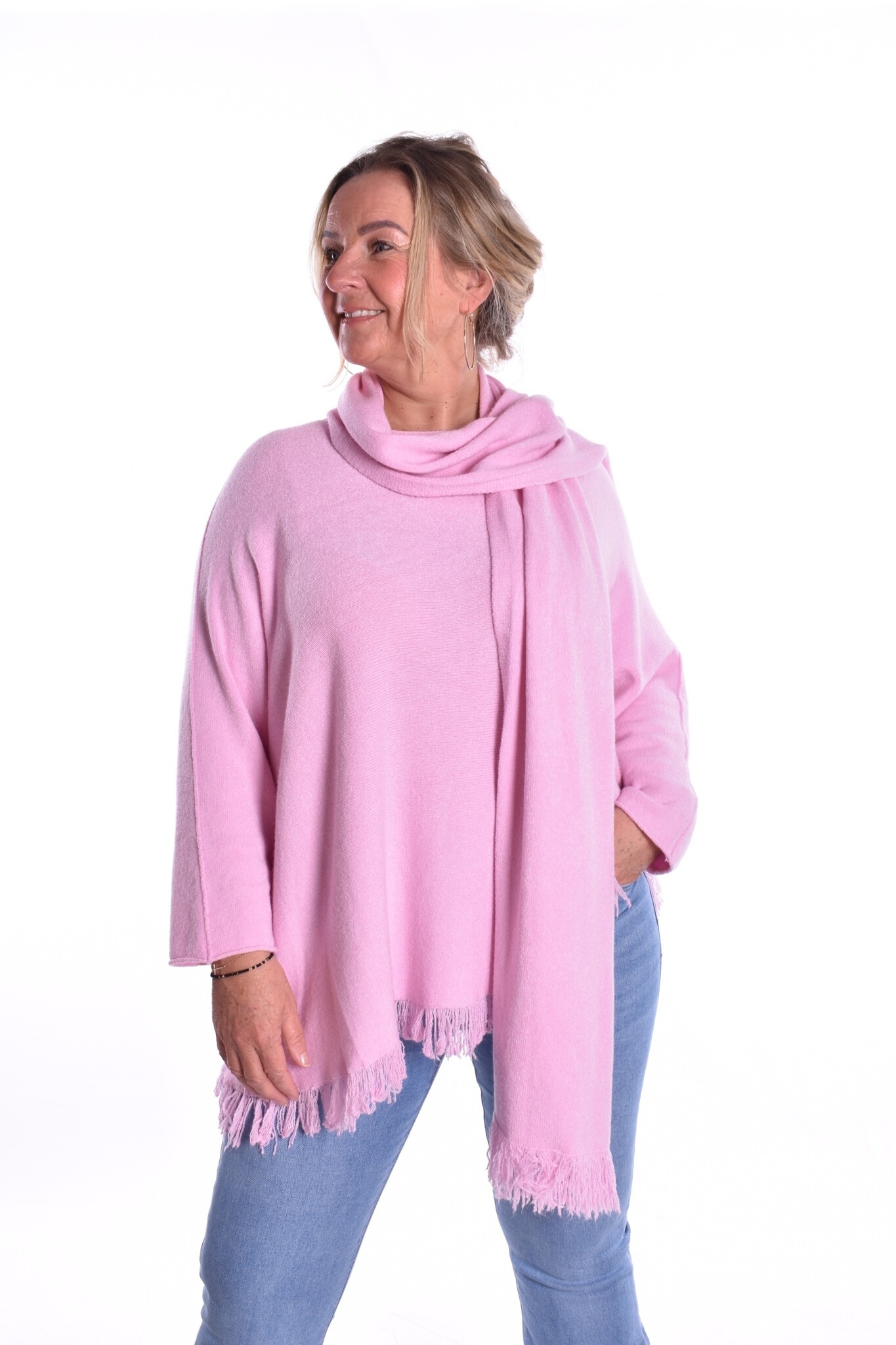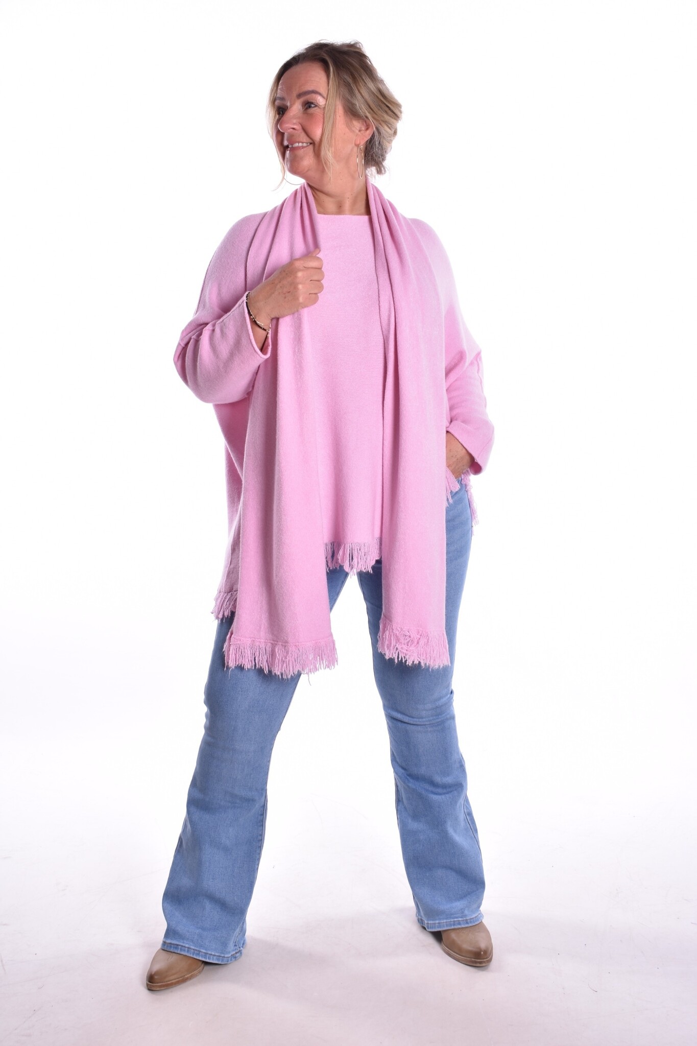 Fijn gebreide trui van zacht breisel met bijpassende sjaal. De trui heeft leuke franjes aan de onderkant.