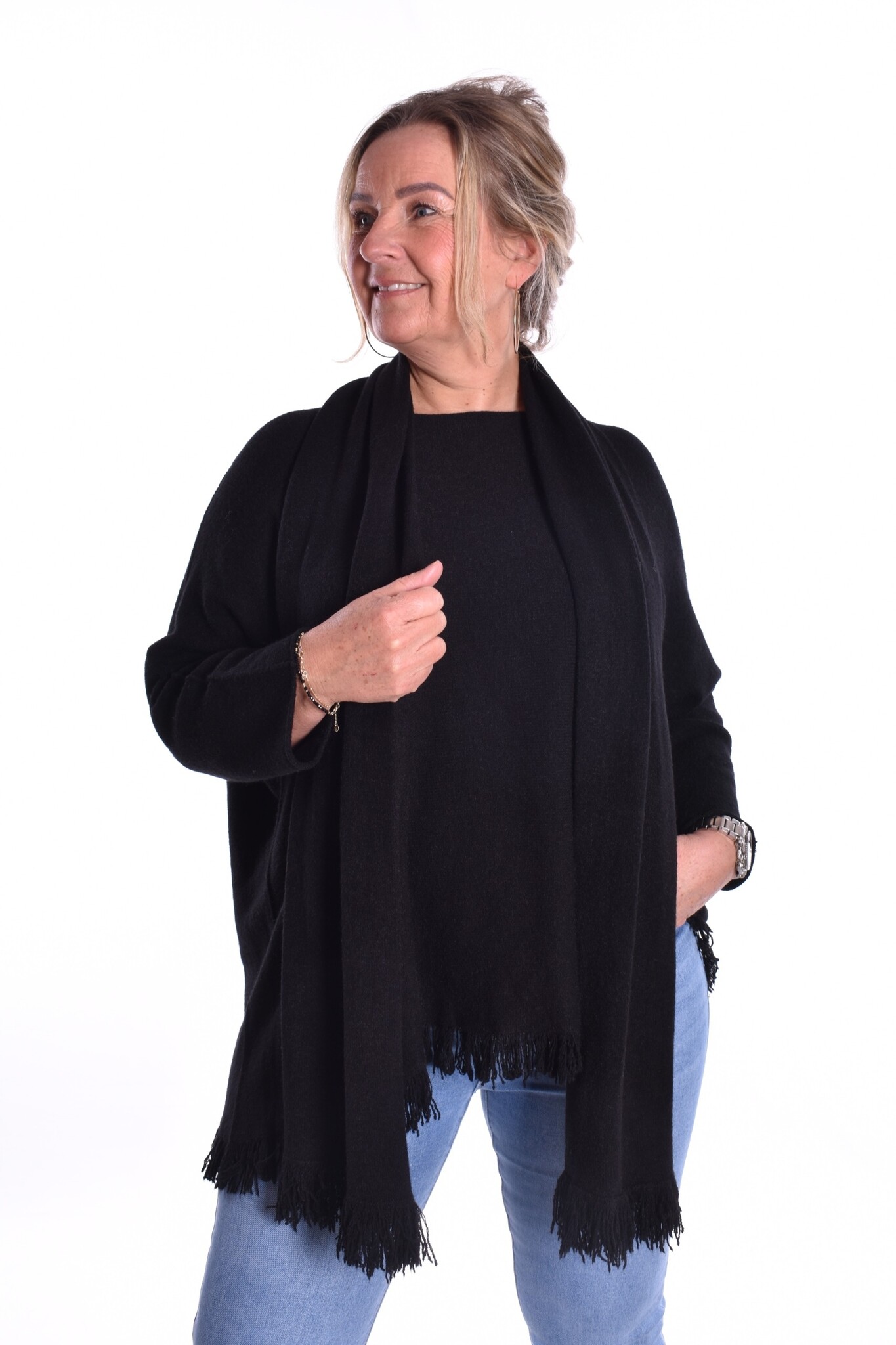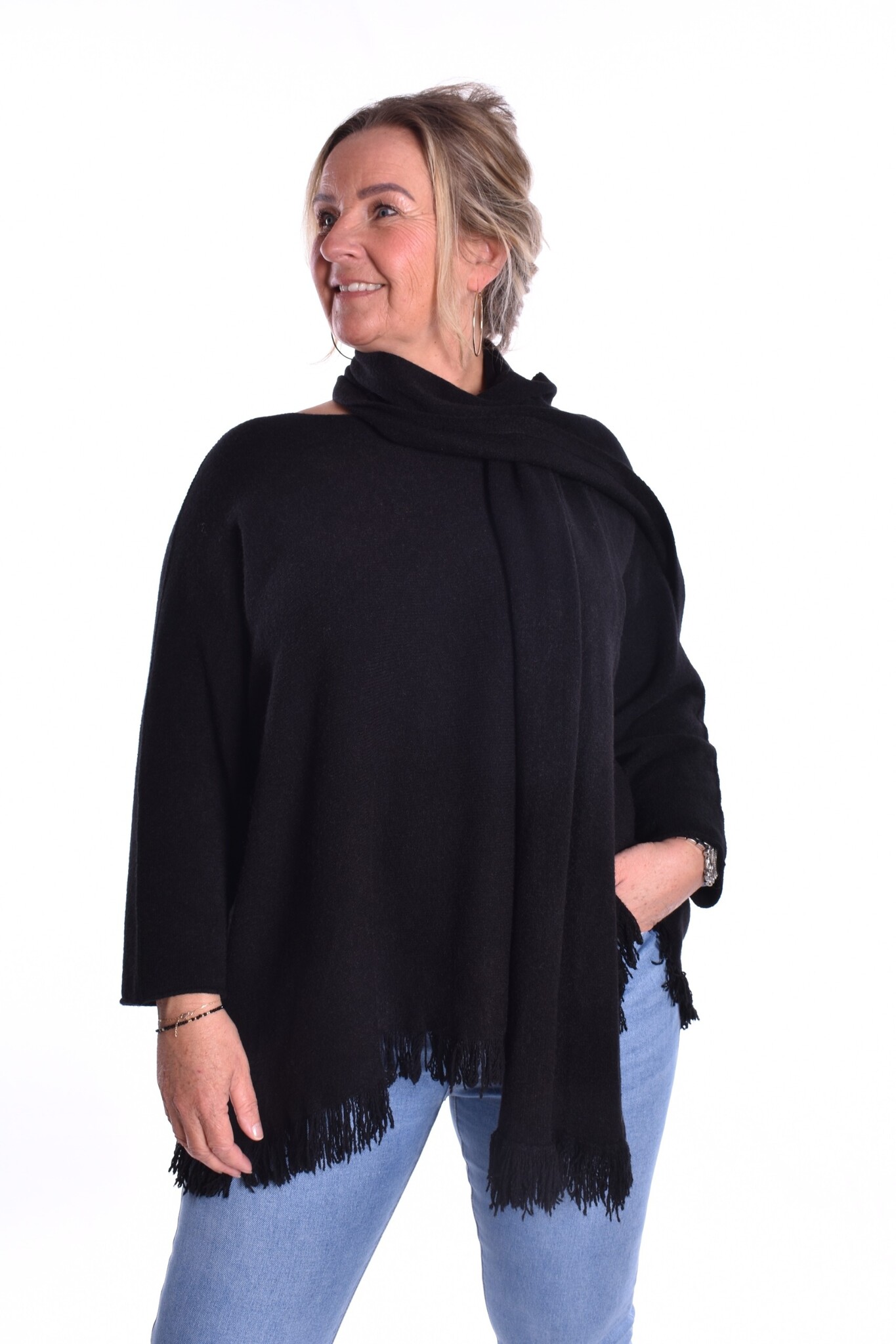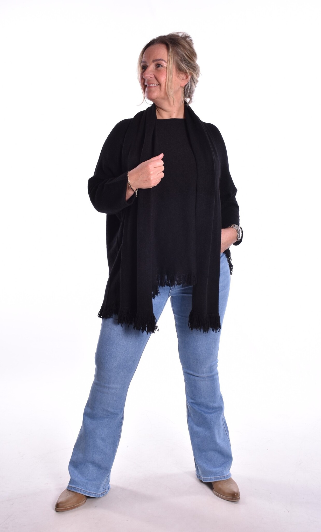 Fijn gebreide trui van zacht breisel met bijpassende sjaal. De trui heeft leuke franjes aan de onderkant.