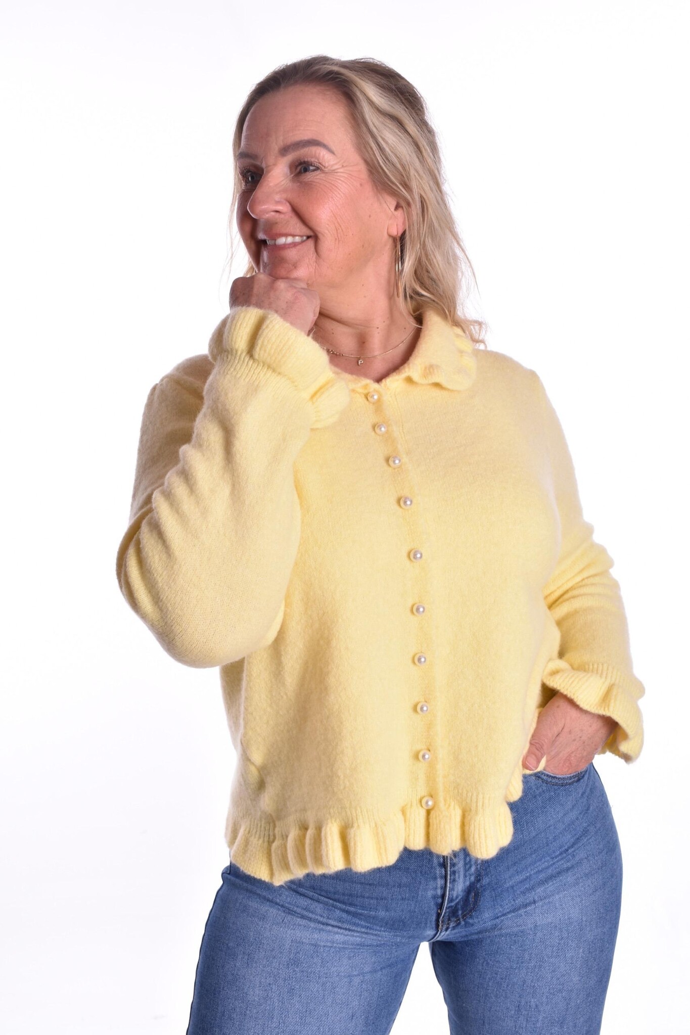 Vest She's a Lady is een warm gebreid vest met een schulp kraagje en schulp randen en parel knoopjes.